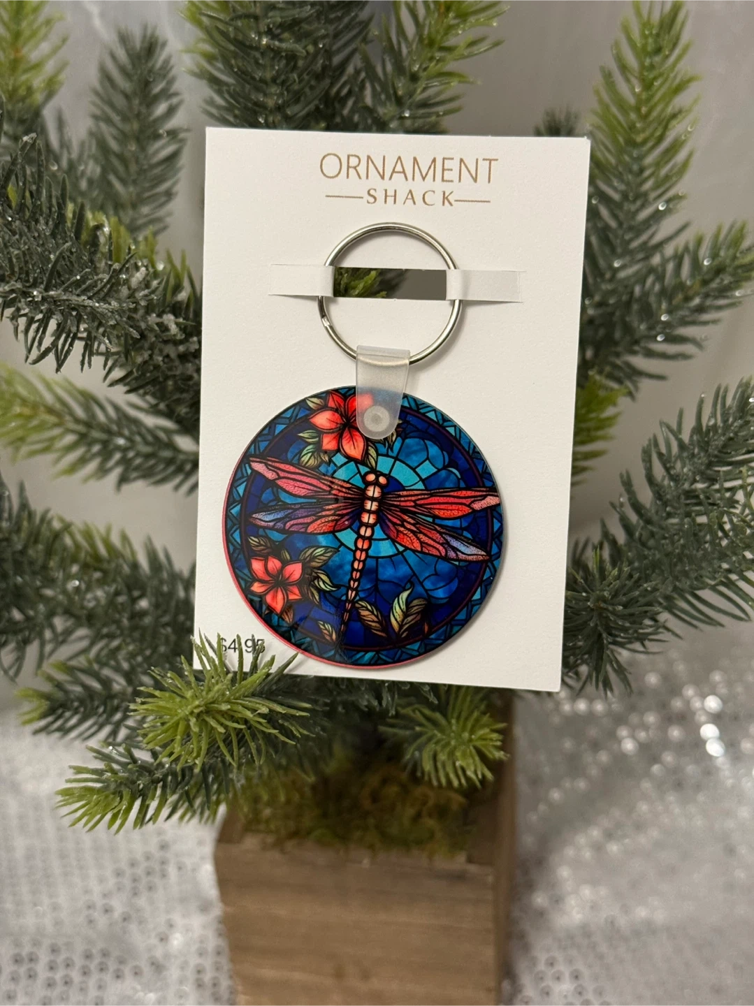 This is a beautiful keychain from Ornament Shack! It features a dragonfly design with a stained glass look. Perfect for adding a touch of whimsy to your keys or bag