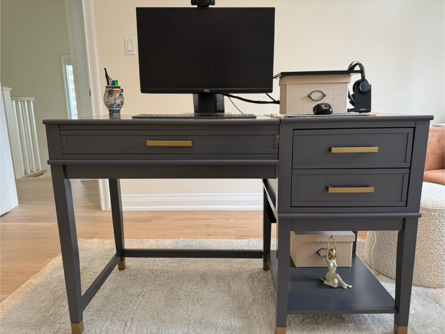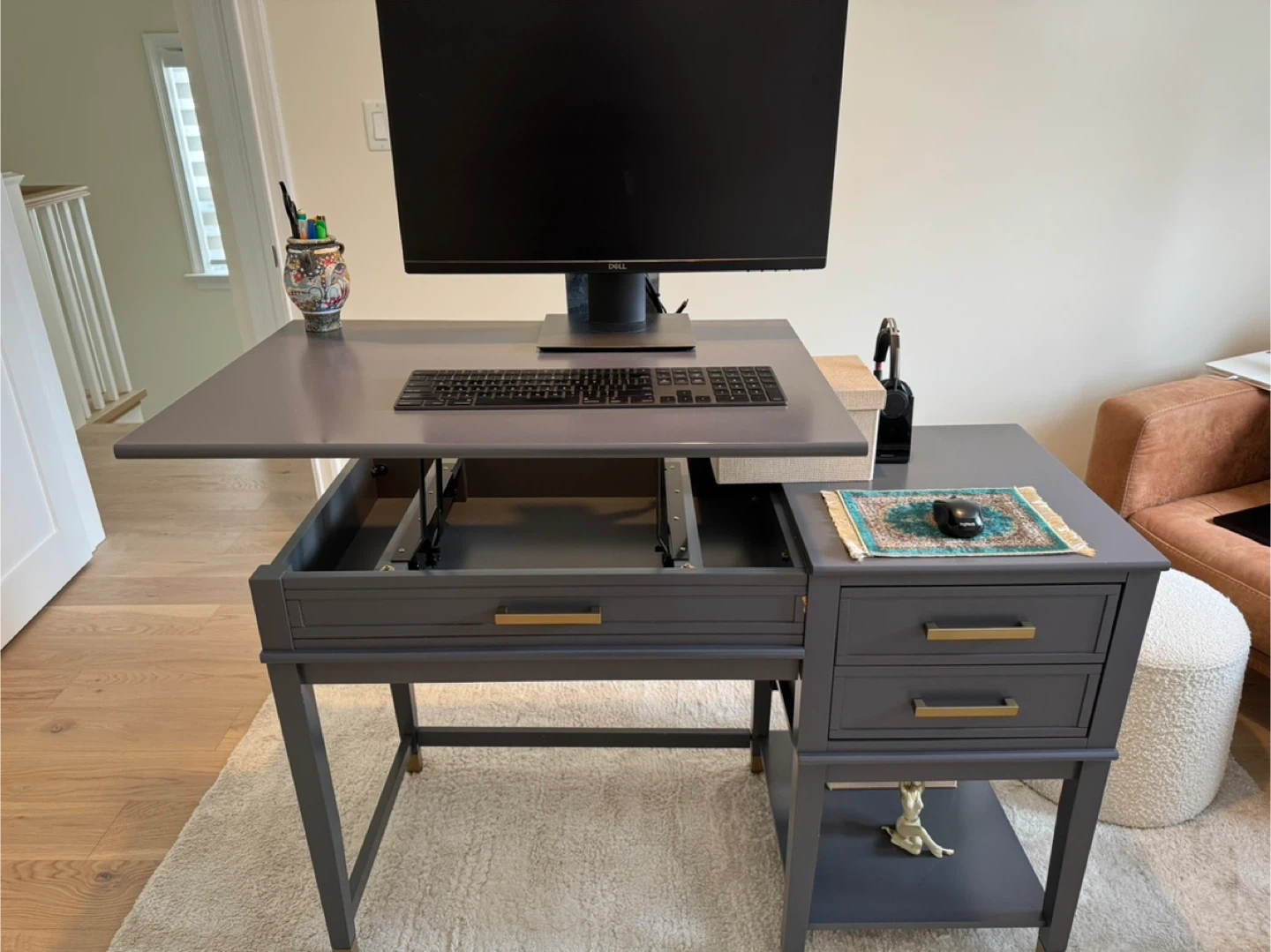 Selling a gray standing desk with drawers. There's a bit of wear on one side, as shown in the photos. It's a great desk for working from home and keeping organized with lots of storage space with drawers, a shelf, and storage inside the desk.