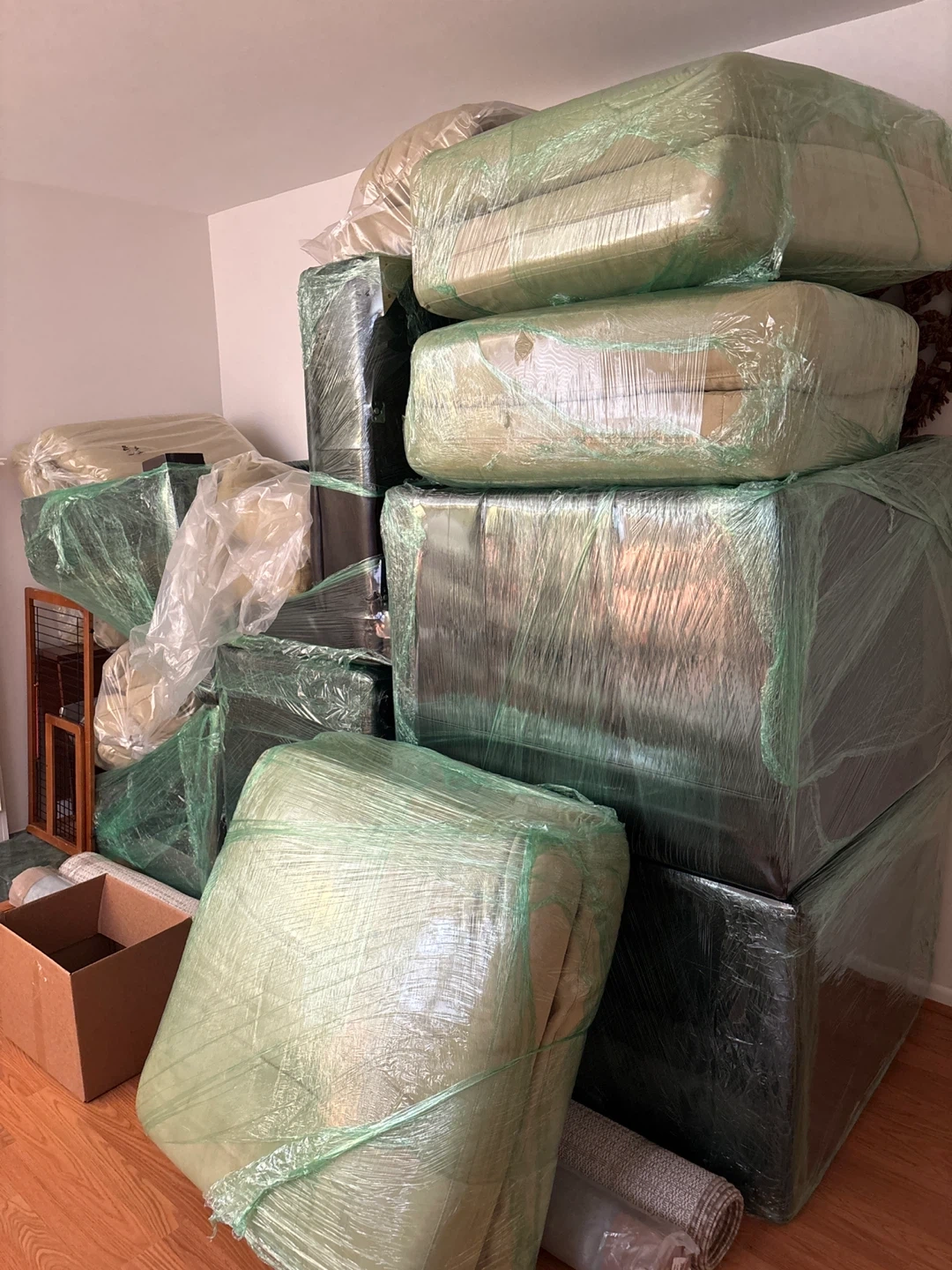 Furniture wrapped for moving. Modular pieces that can be put together as: