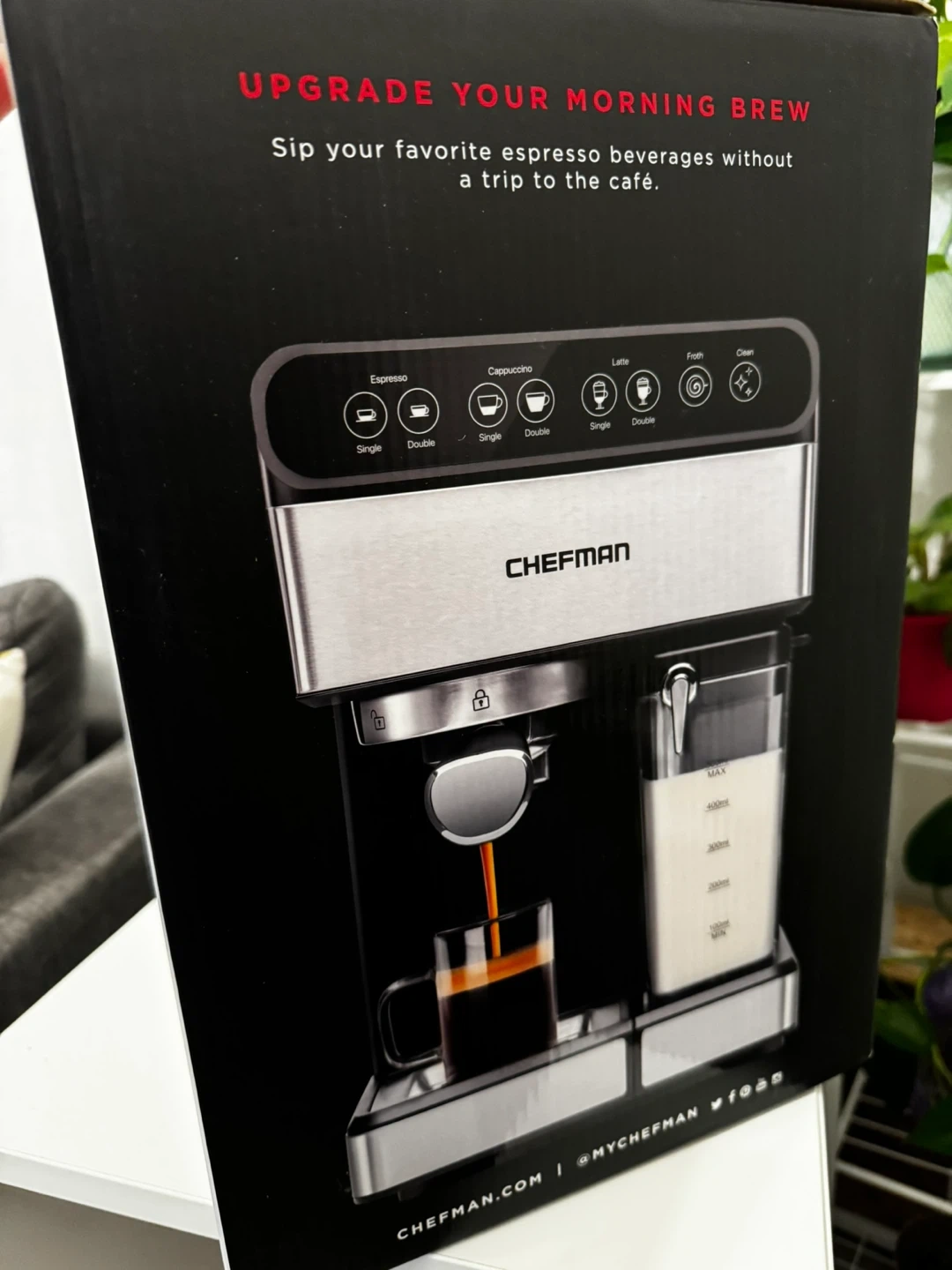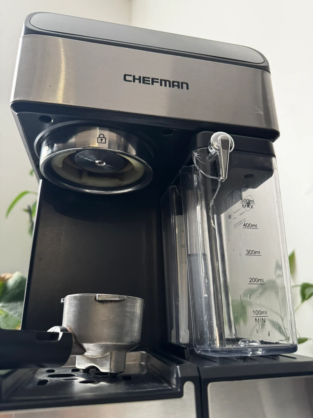 I'm selling a Chefman Espresso Machine+. It's a 6-in-1 beverage center with a powerful 15-bar pump. It can brew café-quality espresso, cappuccinos, lattes, and more! It also has a large 1.8-liter reservoir.The milk container cracked a little bit but working well.