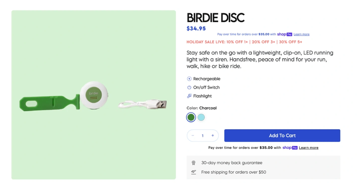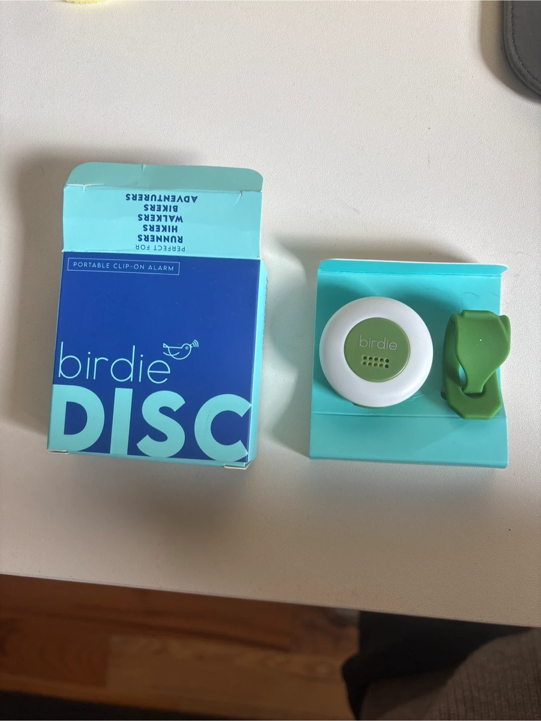 Selling a Birdie Disc portable clip-on alarm. It's green in color and comes with the box brand new. This lightweight disc has a clip-on design and features an on/off switch, flashlight, and is rechargeable! Stay safe on the go with this LED running light and siren, perfect for running, walking, hiking, or bike riding. Originally $34.95.