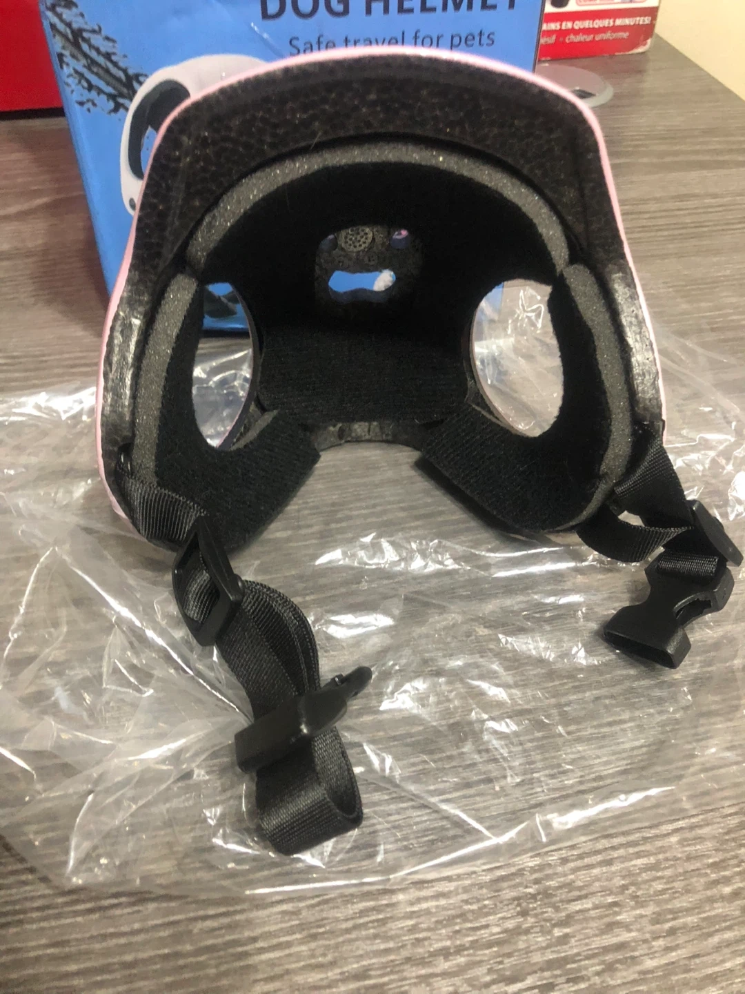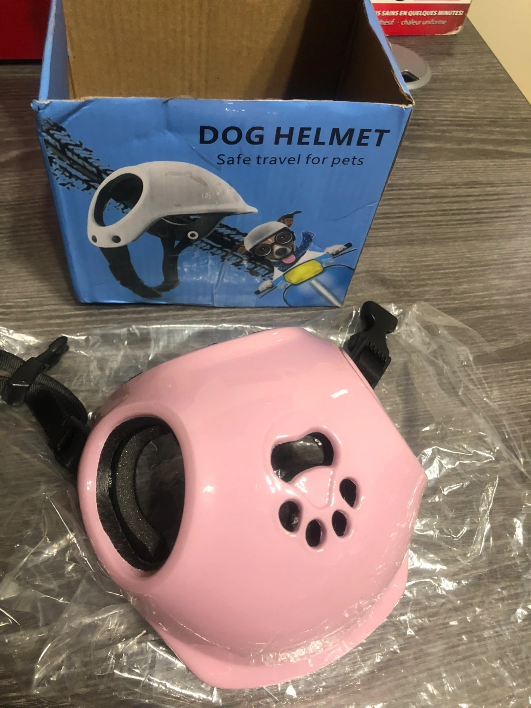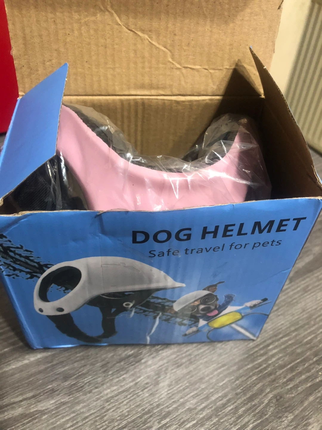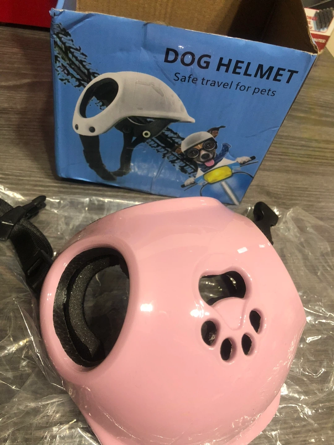 Selling a brand new dog helmet! It's perfect for safe travels with your furry friend. The helmet is pink and comes with its original box.