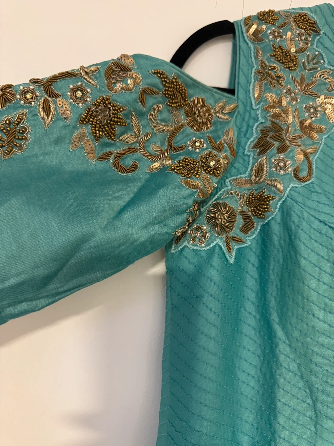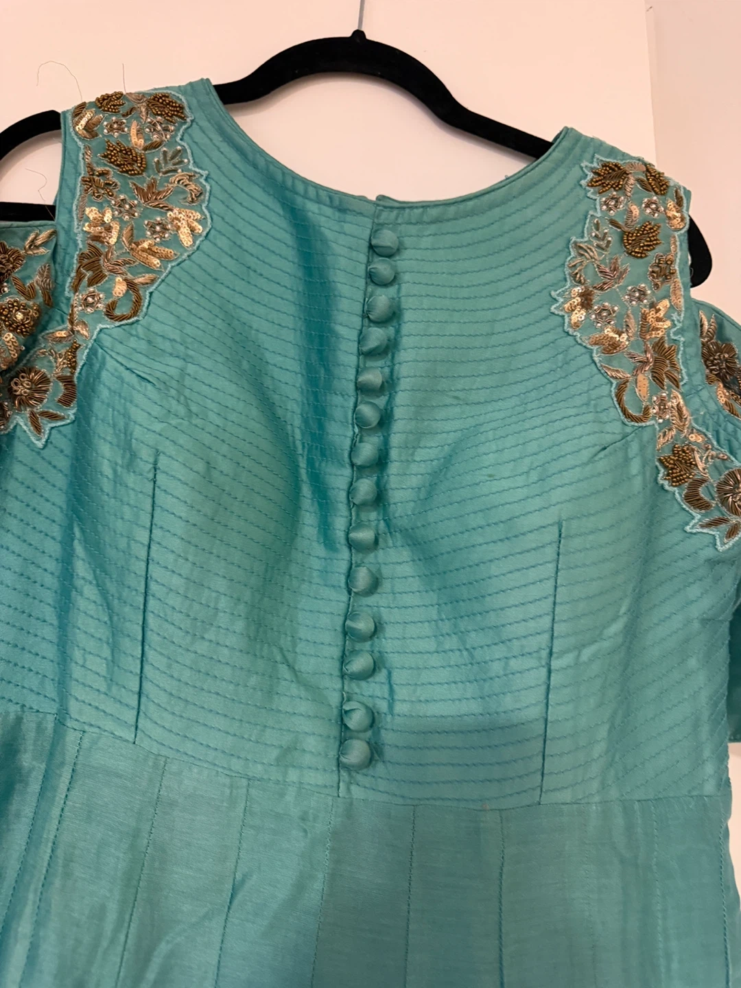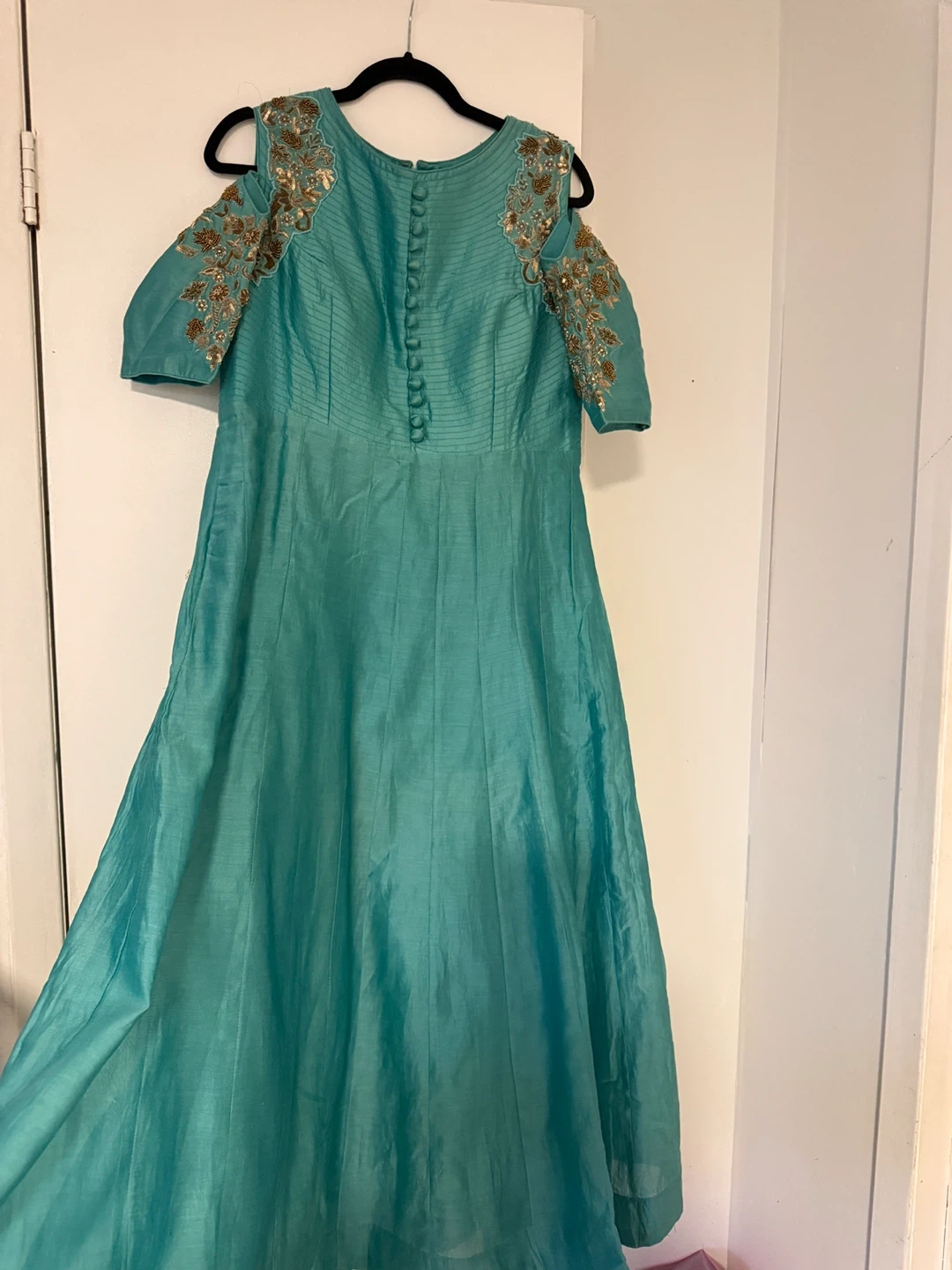 Beautiful teal dress with intricate gold embroidery detailing. The dress features a unique cold-shoulder design and a row of decorative buttons down the back. It's perfect for a special occasion