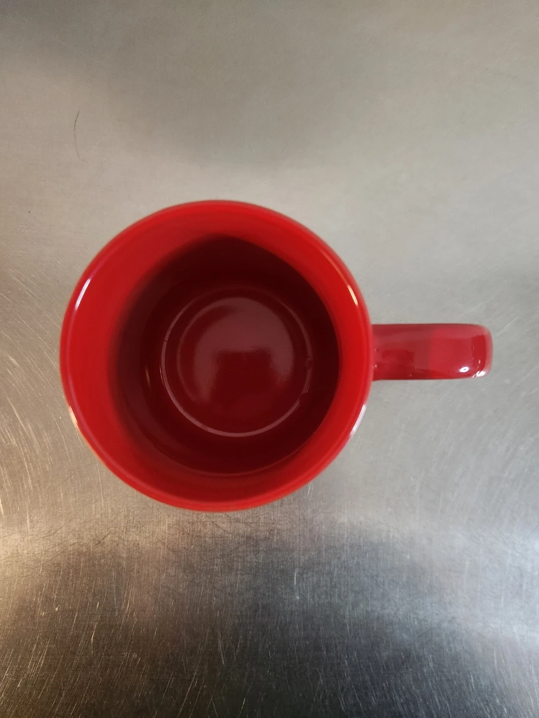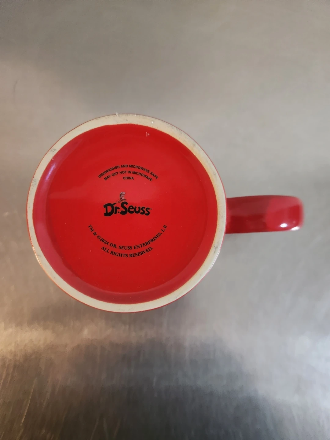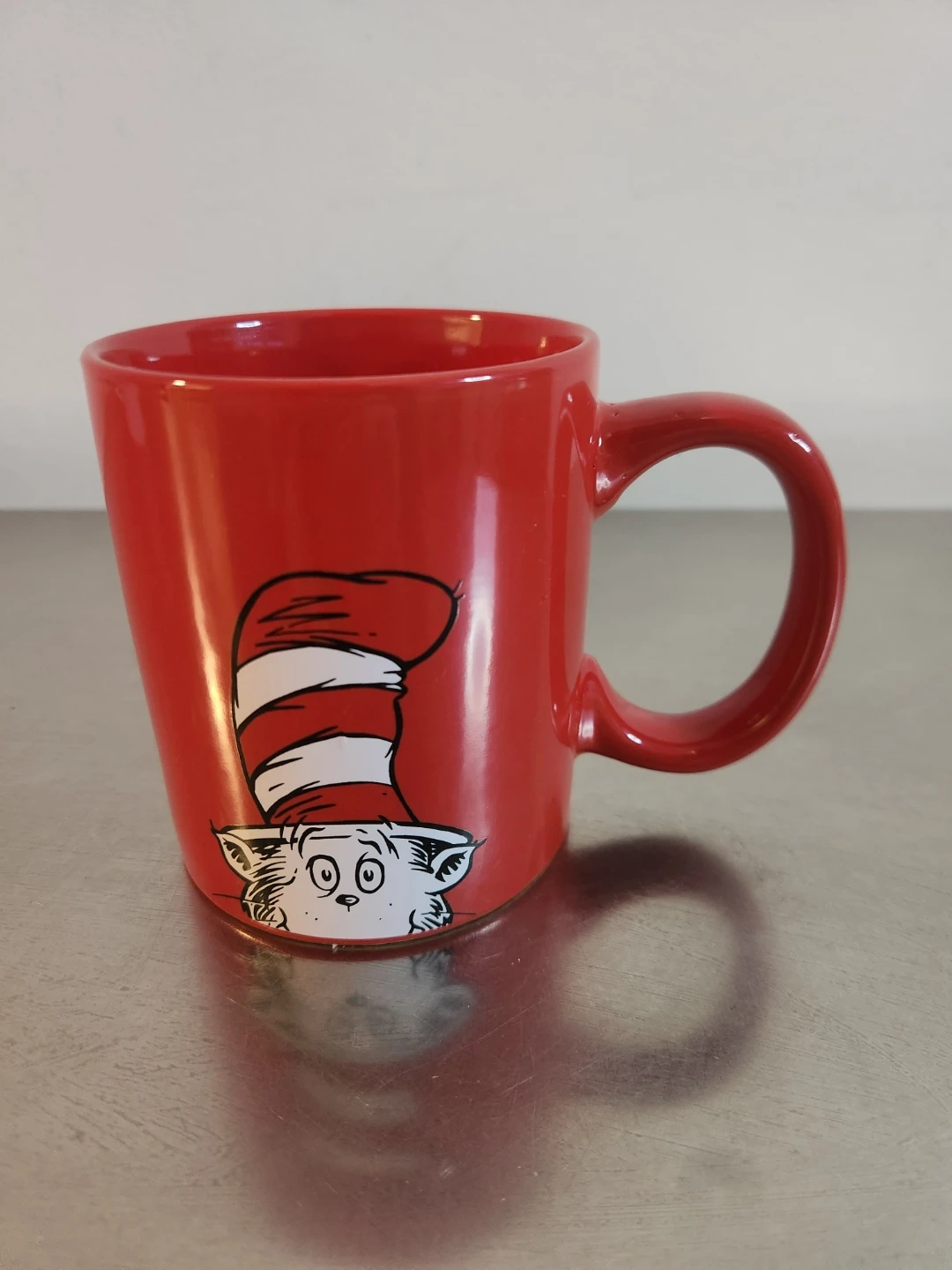 This is a bright red Dr. Seuss mug featuring The Cat in the Hat. It's microwave and dishwasher safe. Ceramic material.