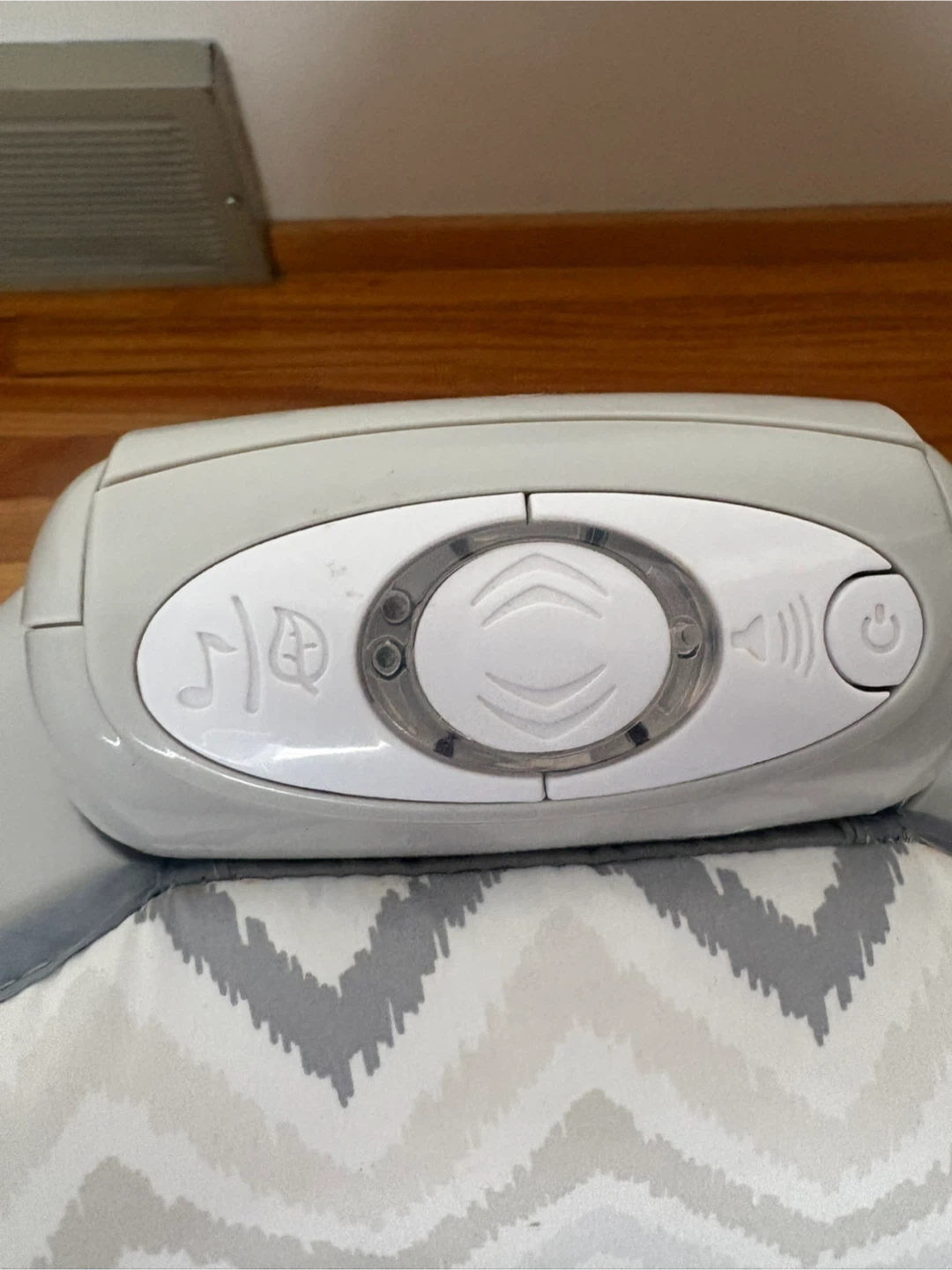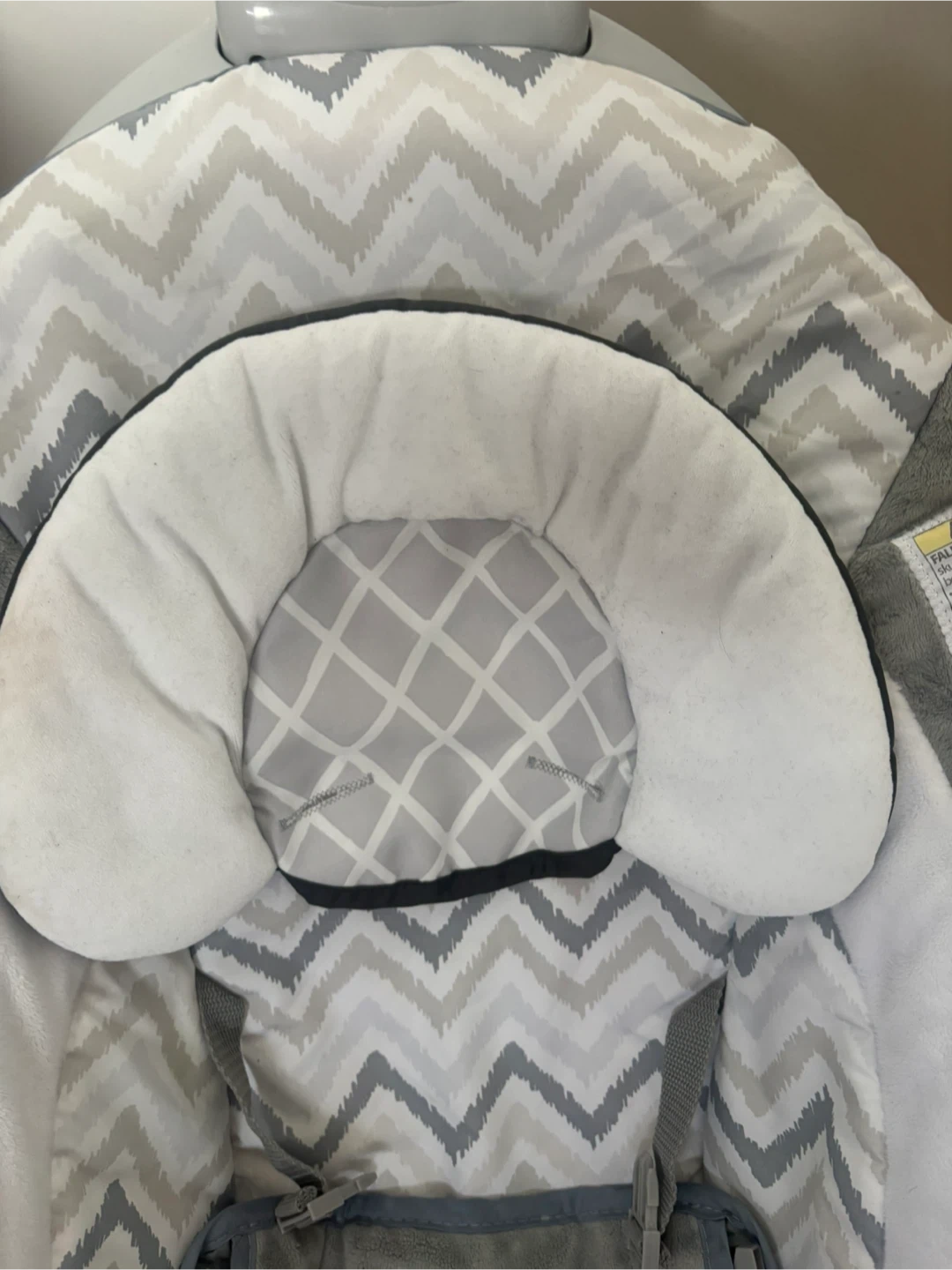 Gently soothe your little one with this baby bouncer seat. It features soft, plush fabrics in a grey chevron pattern and includes gentle vibrations and melodies. The adjustable harness ensures safety and comfort. Includes a new born head piece. Battery operated.