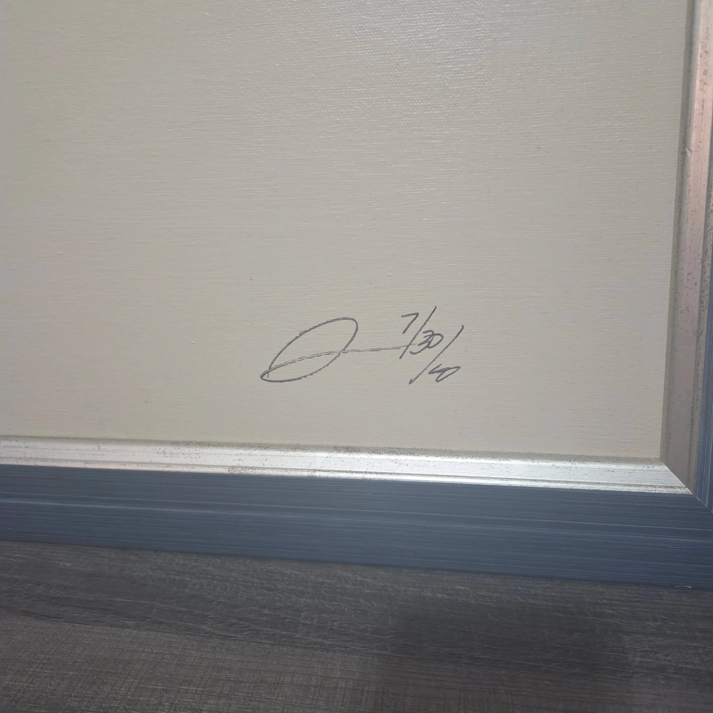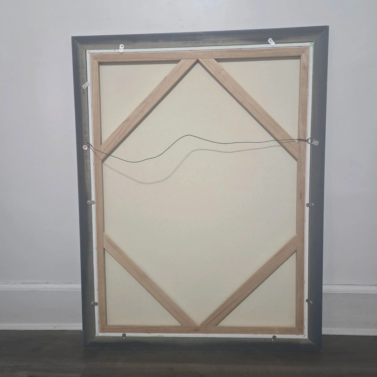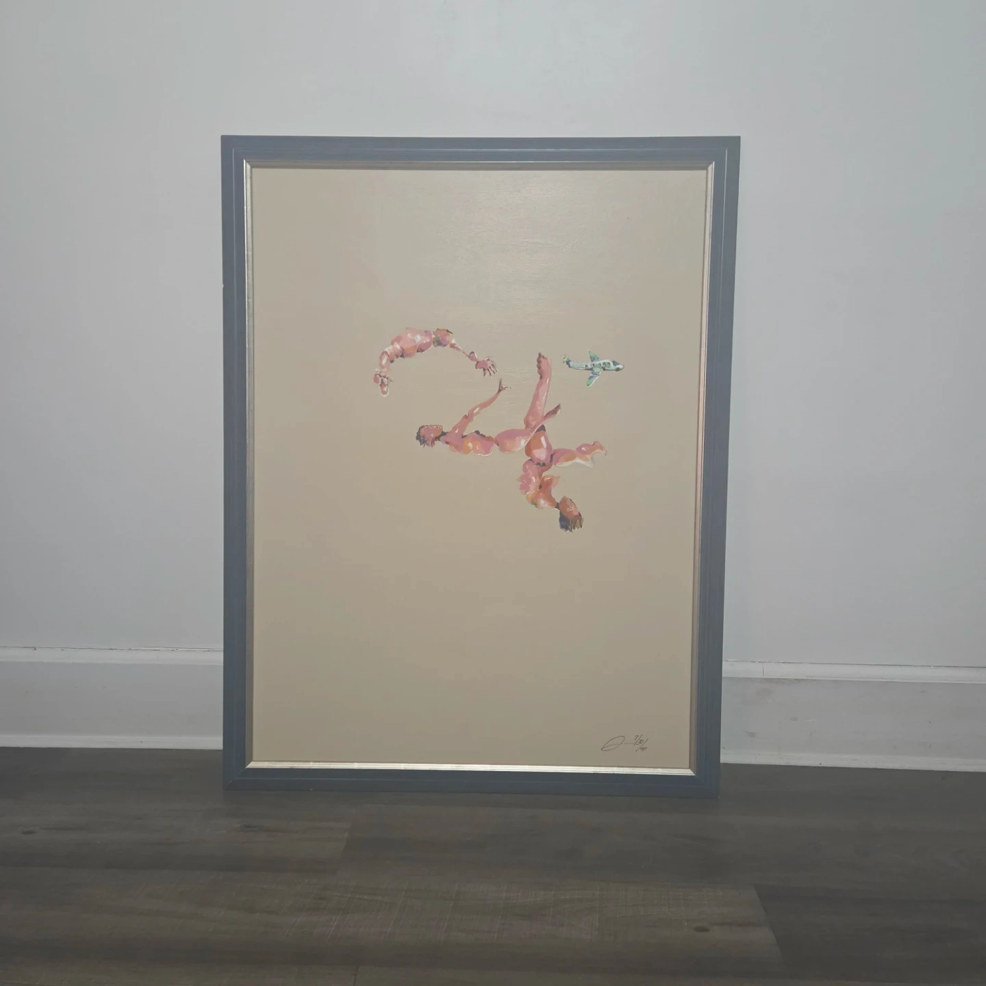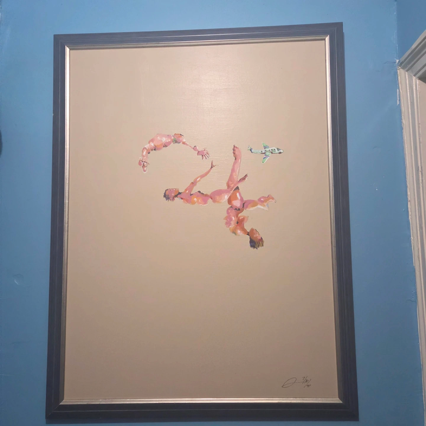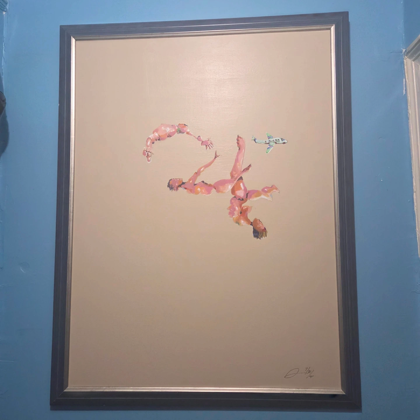 Original framed painting featuring abstract figures and a small airplane. Painting signed and dated 7/30/20. Canvas stretched on wooden frame, housed in a grey painted wood frame. Measures approximately 24x36 inches.
