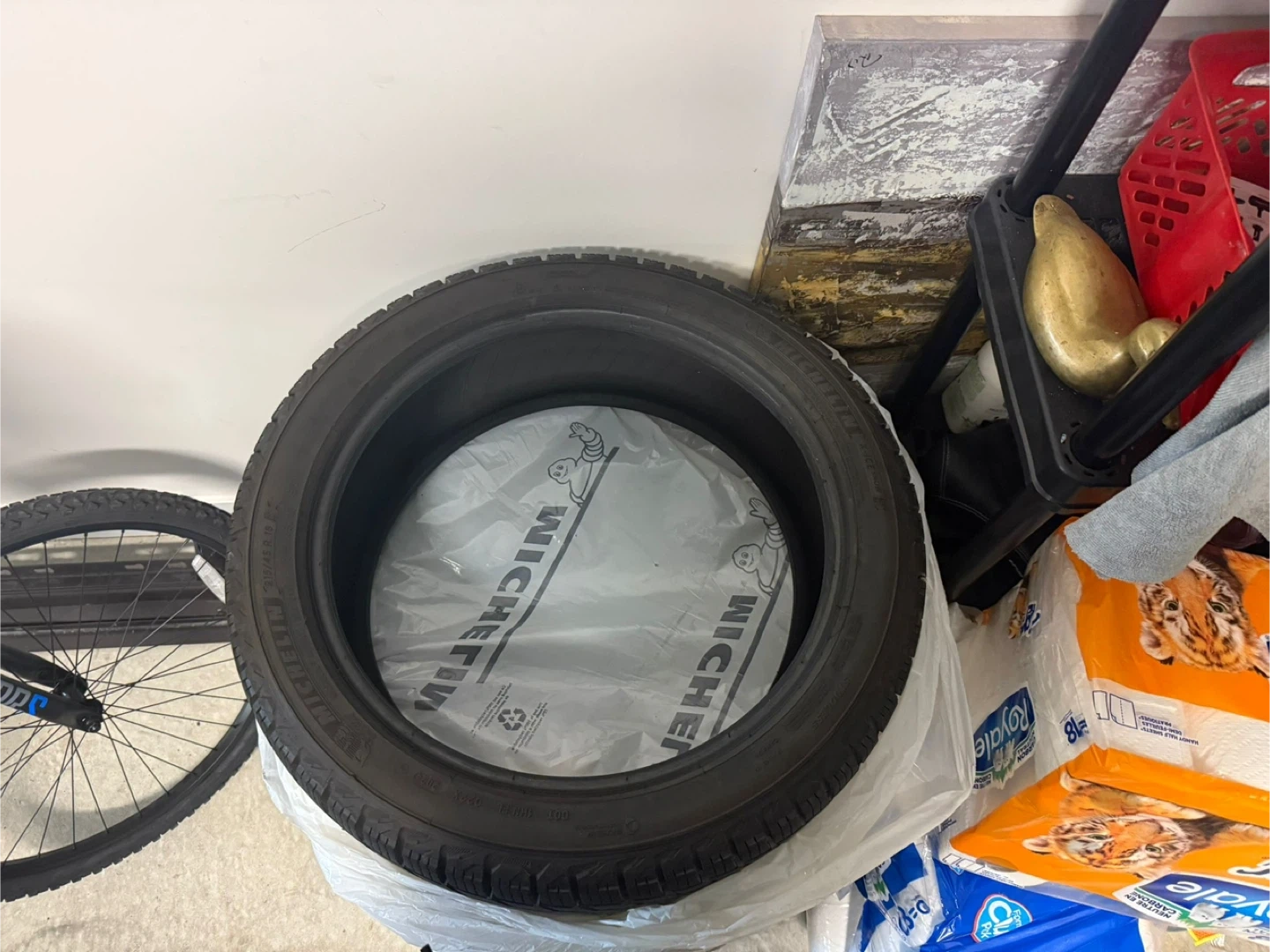 Michelin tire with plastic wrapping. Size details are visible on the tire itself. Great for replacing a worn-out tire! These are winter tires numbers are on the tire it self 215/45 R 18 300 per tire 100% life remaining