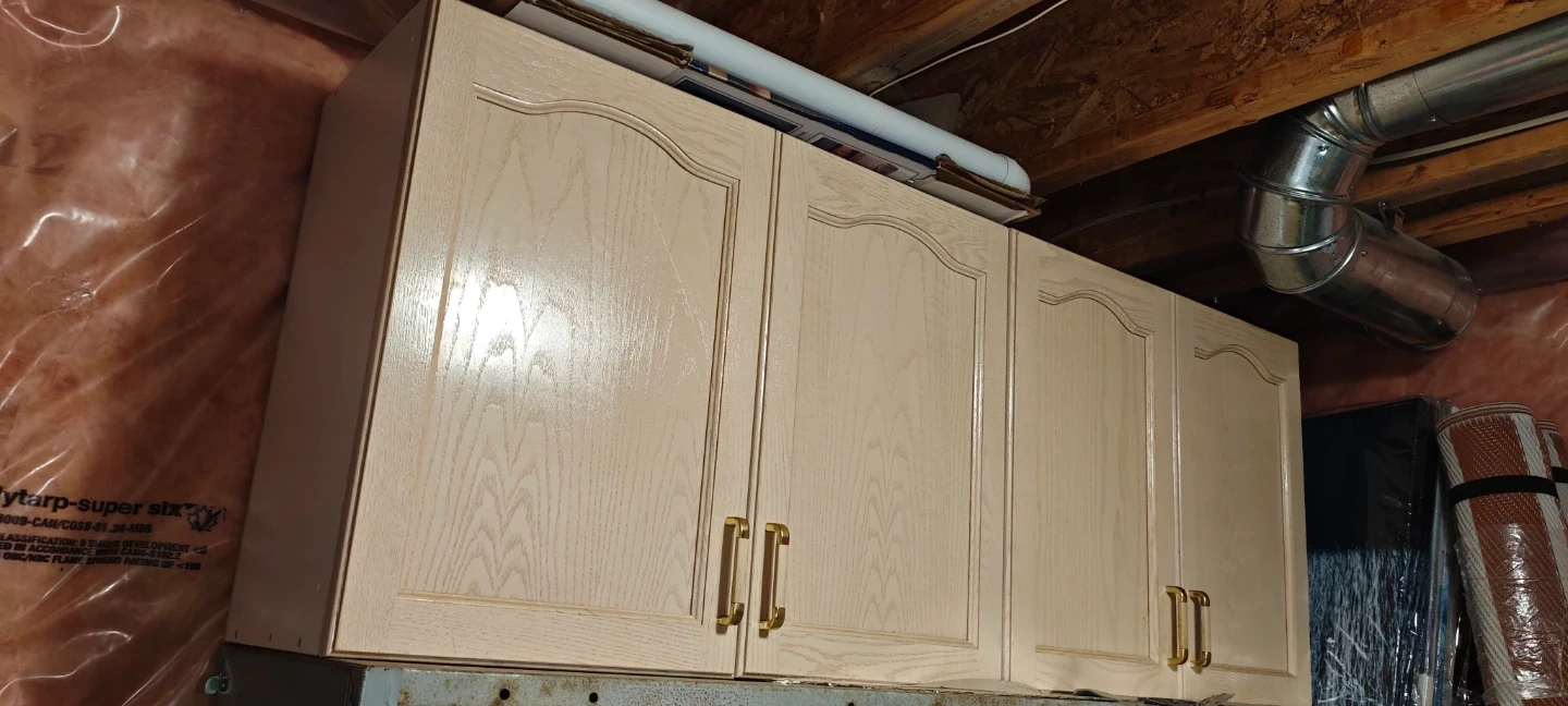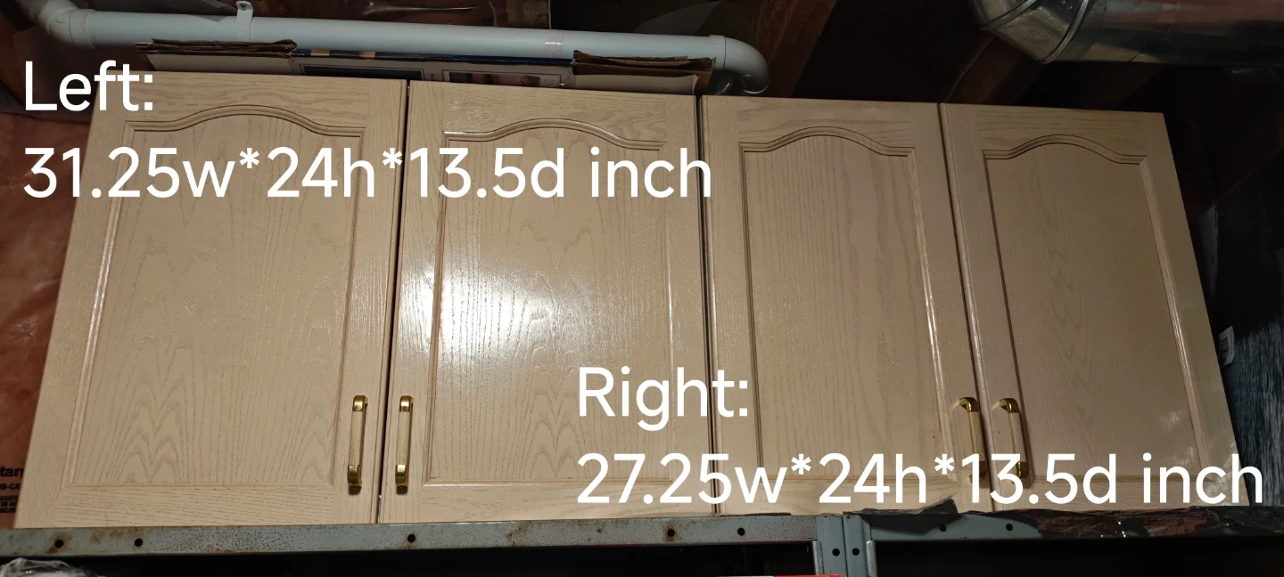 Four upper kitchen cabinets with a light oak finish and gold handles. Dimensions for left cabinets are 31.25"w*24"h*13.5"d, and for the right cabinet, they are 27.25"w*24"h*13.5"d. These cabinets offer ample storage space for your kitchen needs.