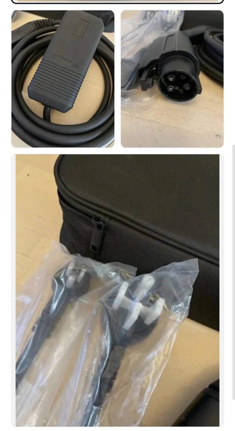 This is a EV charger cable with multiple plug adapters and a carrying case. It includes various adapters for different charging needs. The cable is black and comes with a zippered black case for storage and transport. New