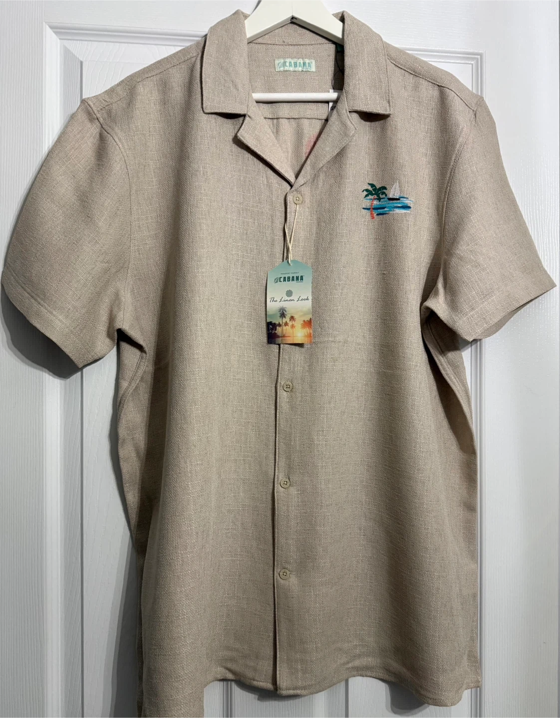 Cabana Fashions short sleeve button-up shirt in a stone colour. It's made of 100% polyester with a "The Linen Look" tag. Features a tropical graphic on the back. Size XL.