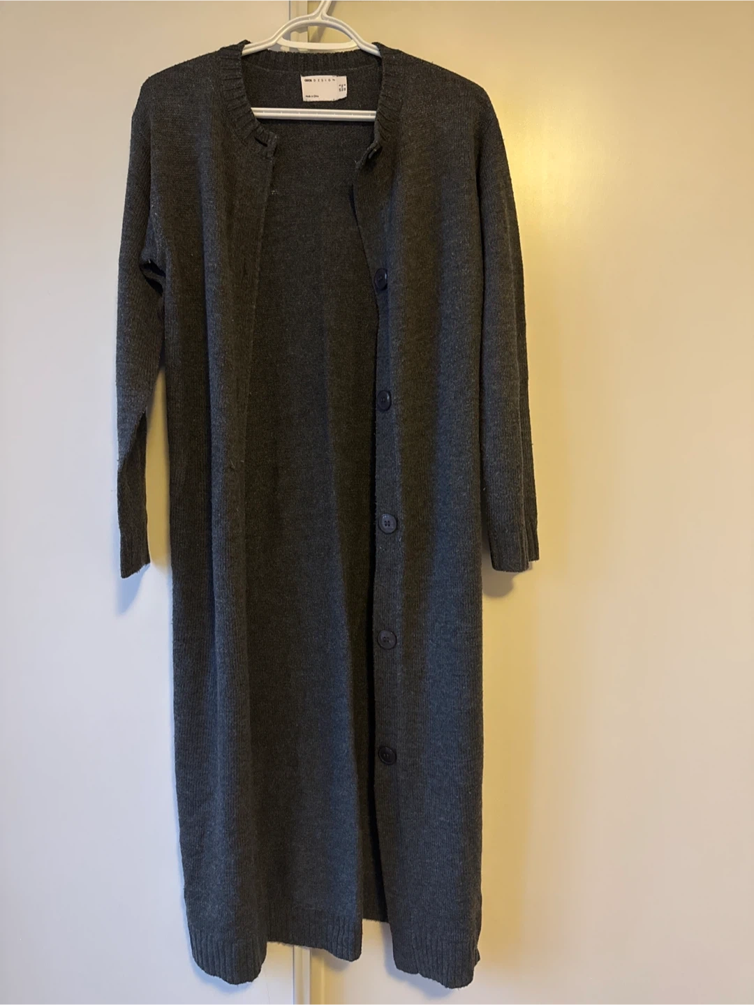 Selling an ASOS Design grey cardigan. It's in good used condition and ready for a new owner! It's a lovely knitted midi dress with collar detailing.