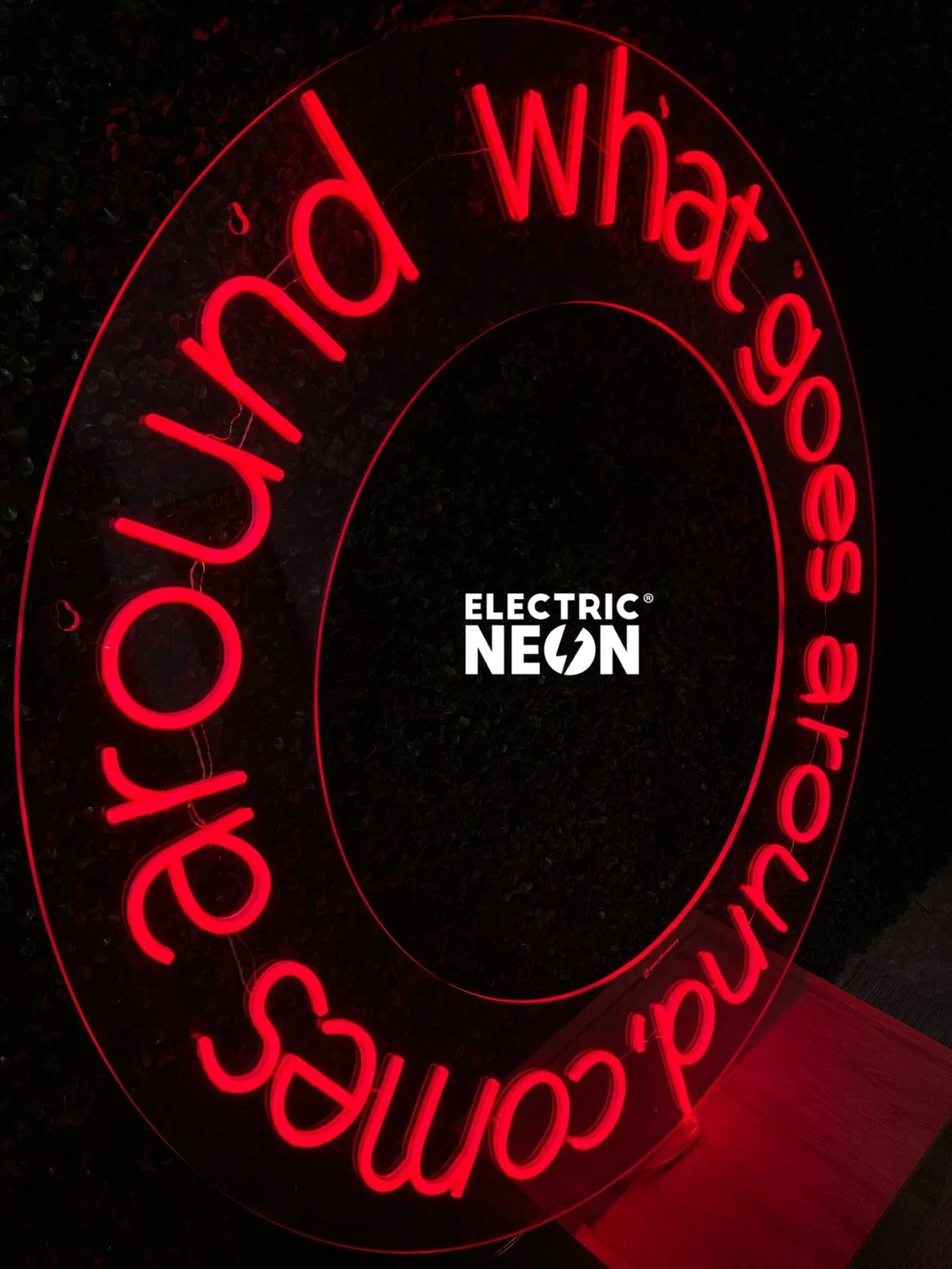 Add a cool vibe to your space with this led Neon sign! It features the phrase 'What goes around comes around' in a vibrant red neon light. The sign is 100 cm in diameter and made with a clear acrylic base. Perfect for a bedroom, living room, or even a home office