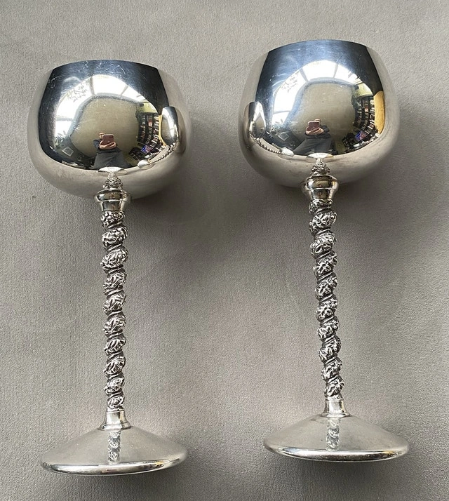 Selling 2 vintage 1960s British Primrose Silver Wine Goblets, E.P. Brass. They are 7 inches / 18 cm tall and in perfect condition. Price: $30. Cash or cashless payment accepted. Owner selling.