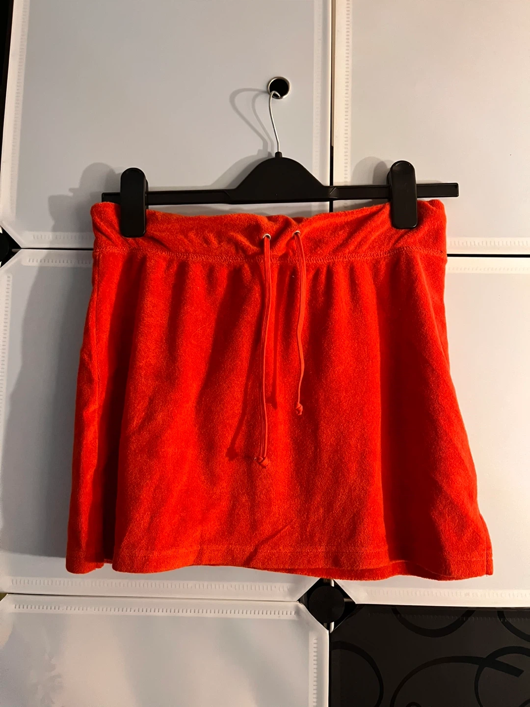 This is an orange velour skirt with a drawstring waist. It's made of soft material. This would be great for lounging or casual wear!