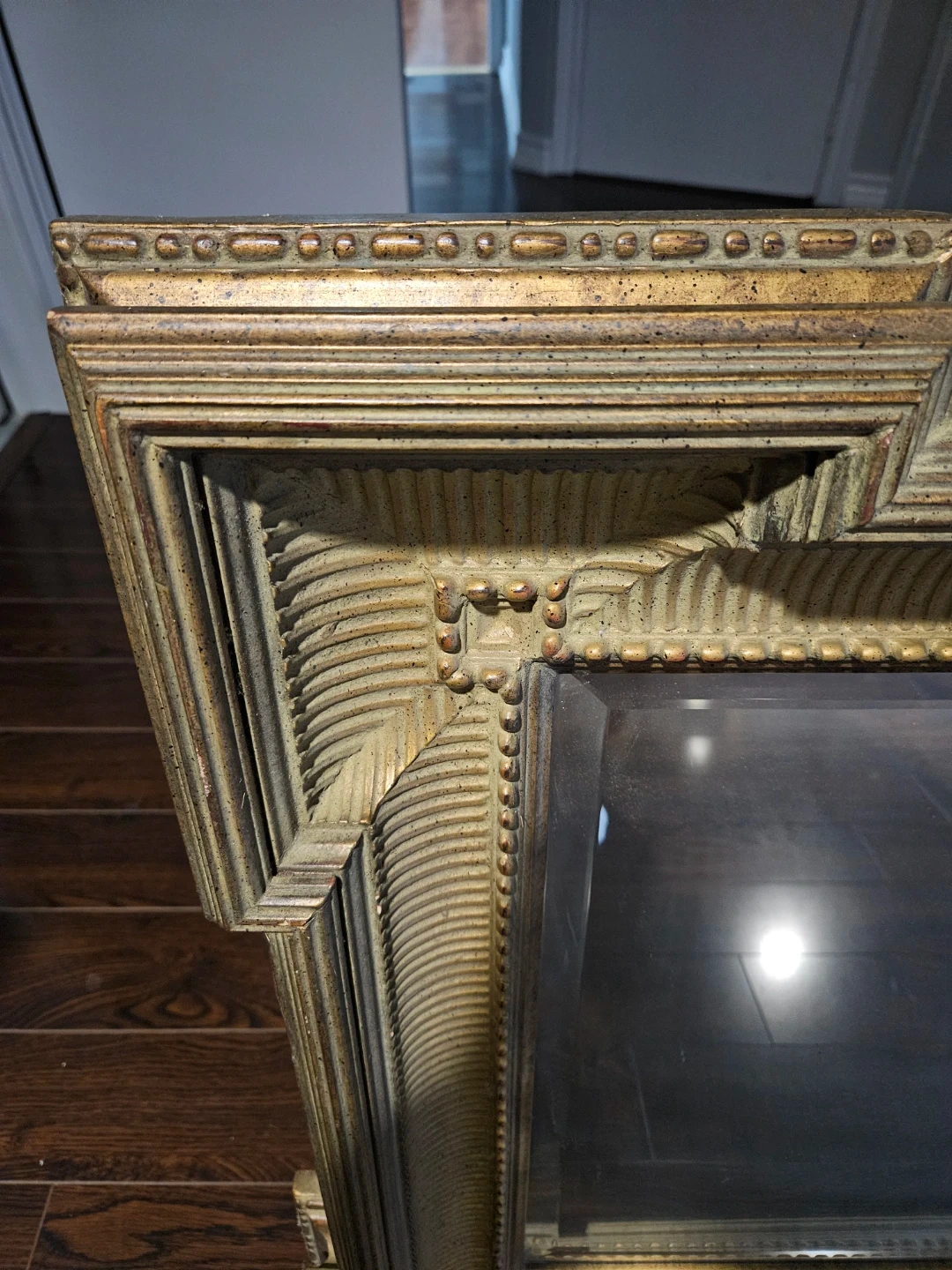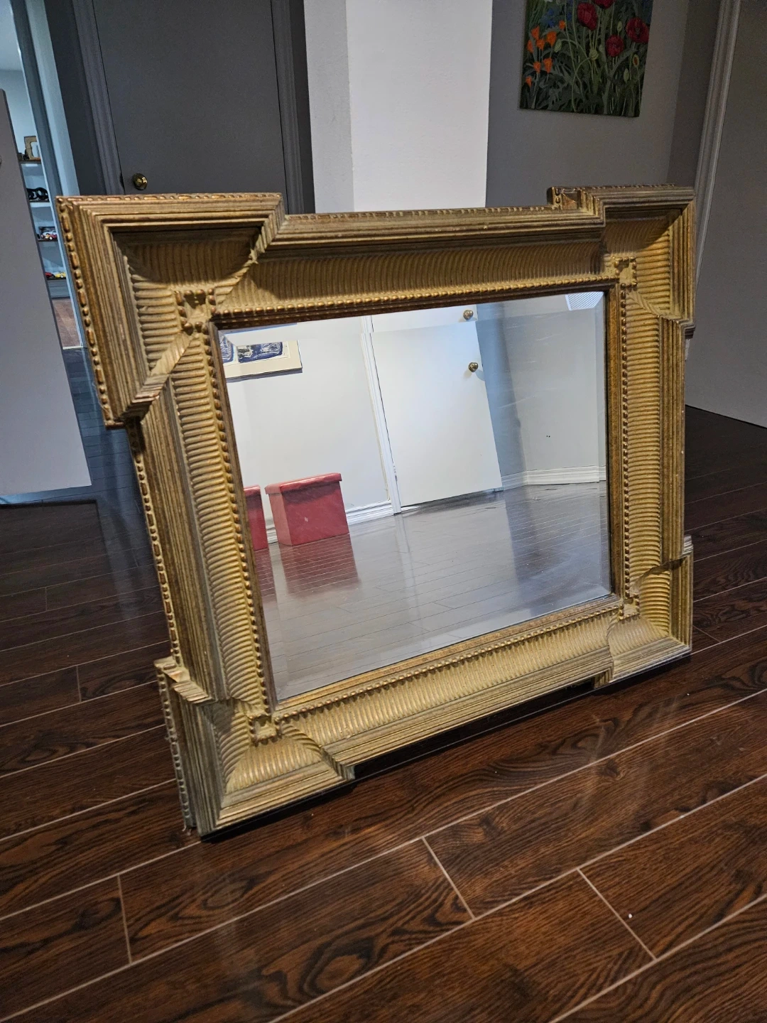 This is a beautiful ornate mirror with a gold-toned frame. The frame has intricate detailing and a classic design. It's a substantial piece that would add a decorative touch to any room.