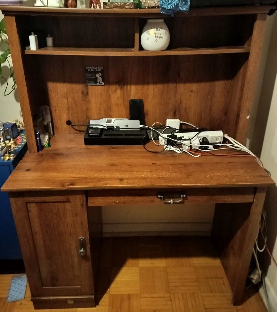 Desk with hutch, includes a drawer and cabinet door. Good condition, some wear and tear. No visible brand on the item.