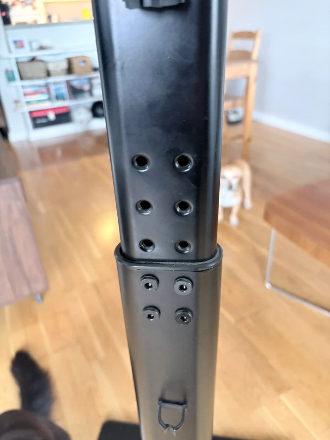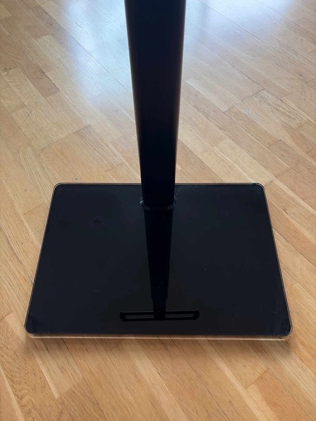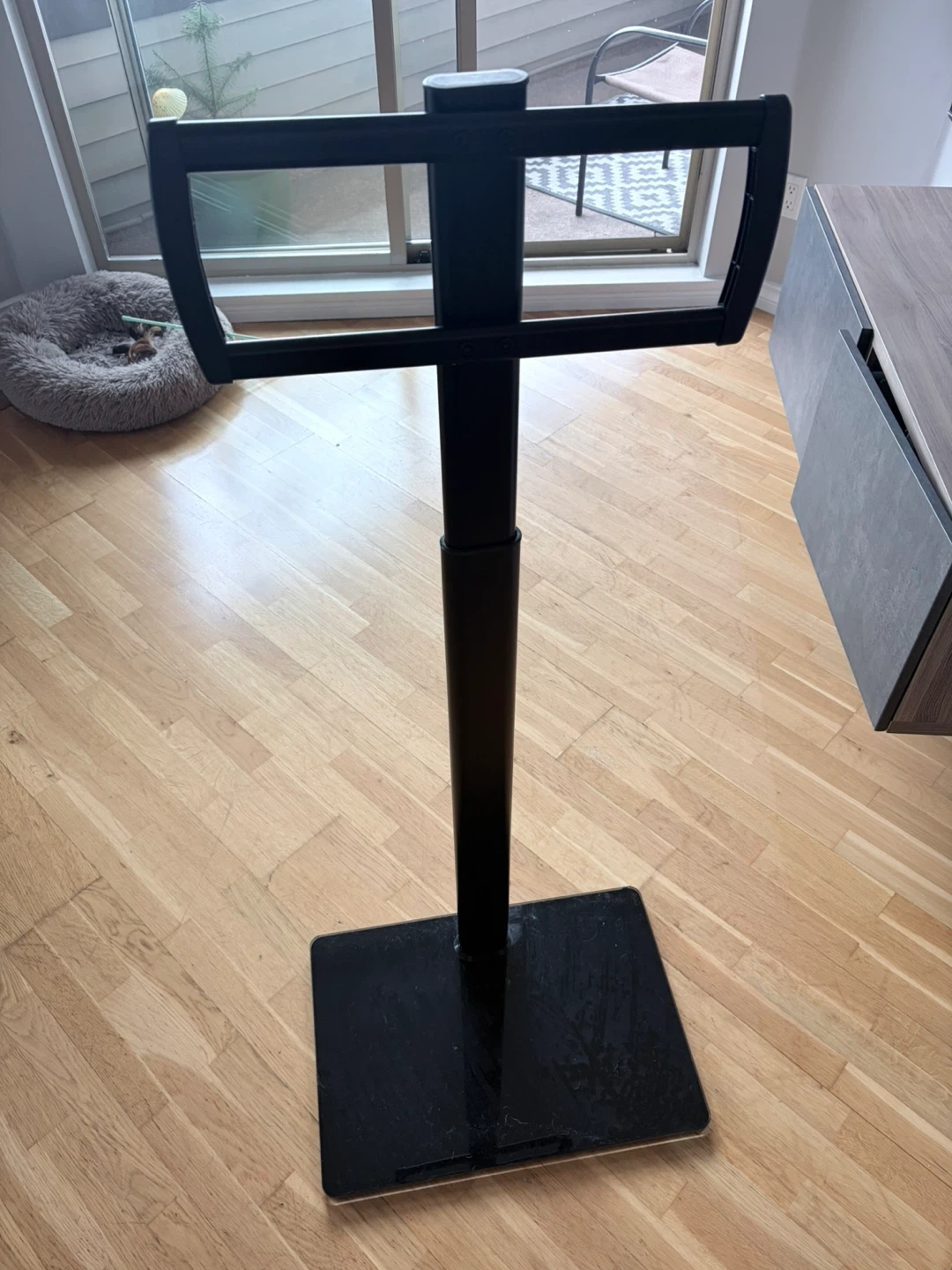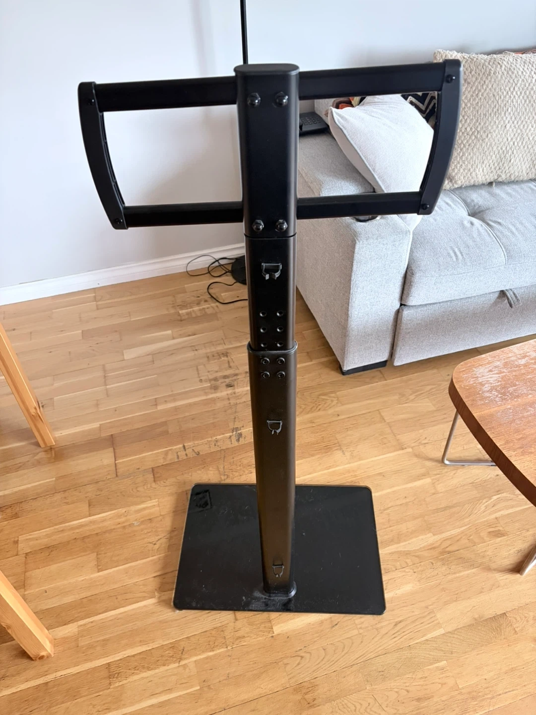 Black metal TV stand. It's 4'2" tall and 17 inches wide. Great for smaller spaces or when you don't want to mount your TV!
