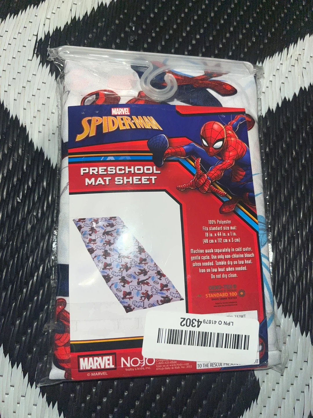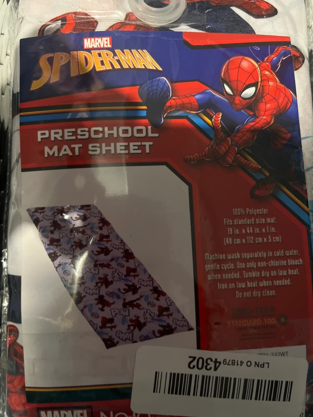 This is a Marvel Spider-Man preschool mat sheet. It fits a standard size mat, measuring 19 in. x 44 in. x 1 in. (48 cm x 112 cm x 3 cm). The sheet is made of 100% polyester and is machine washable on a cold, gentle cycle. It's tumble dry low heat and can be ironed on low heat if needed; do not dry clean.