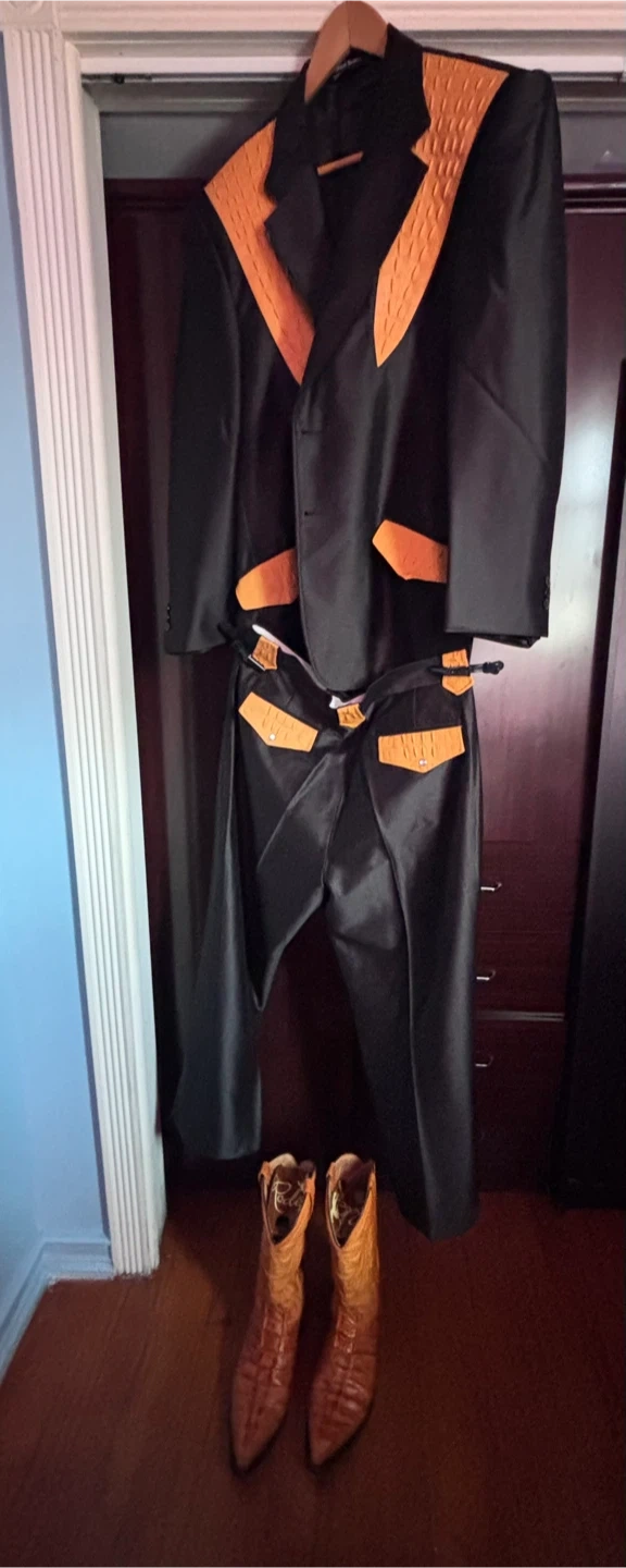 The Original Ostrich Shawl Style Cowboy Jacket in Black Butter Suit with matching boots is a stylish and unique outfit perfect for those looking to showcase their cowboy and western theme. This complete outfit in black and yellow features a standout shawl style jacket, complemented by matching boots, giving off a fashionable and authentic cowboy vibe. Perfect for special occasions or everyday wear, this piece is sure to make a statement and turn heads wherever you go.