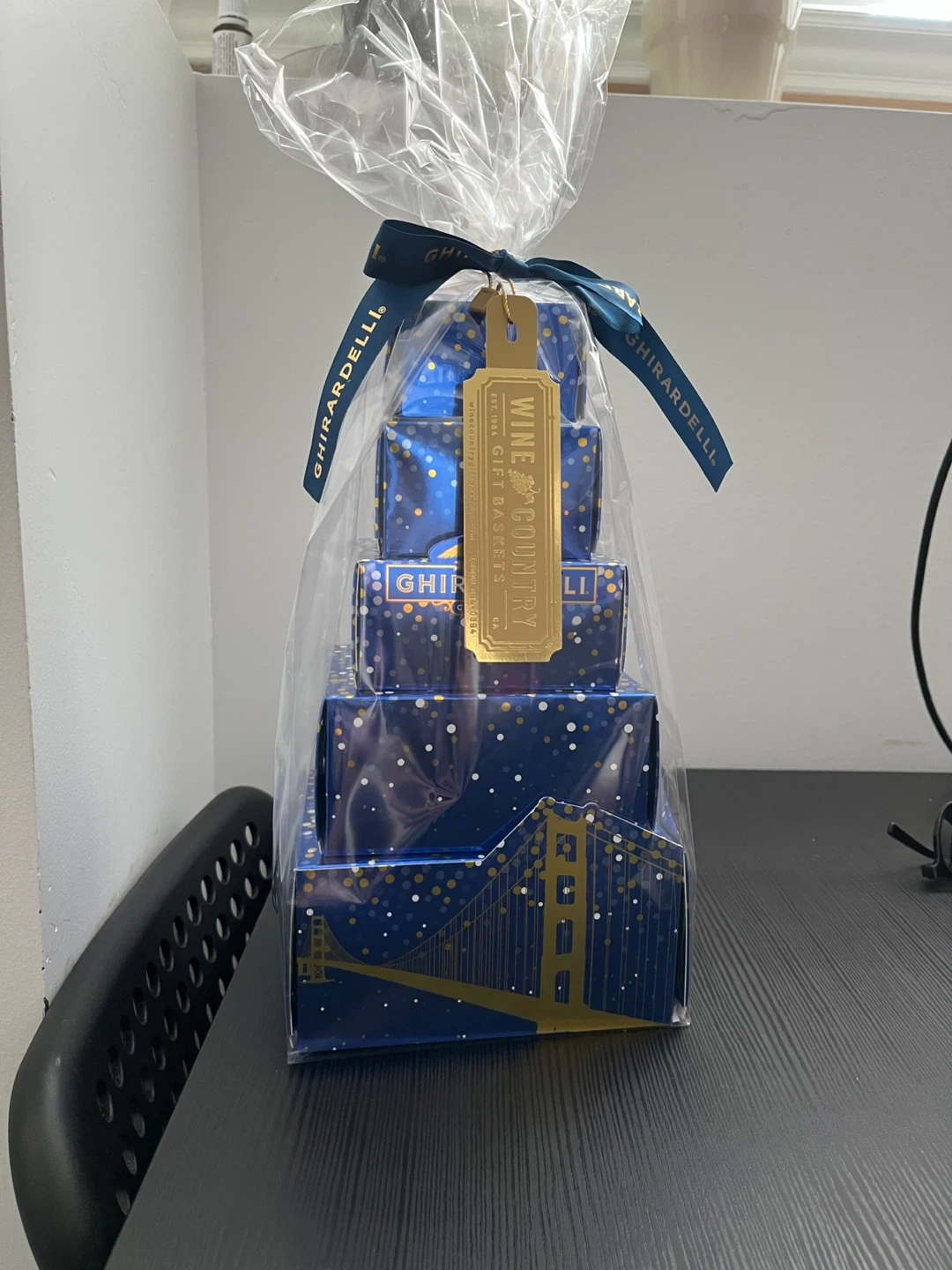 This Ghirardelli chocolate gift tower is a delightful present! It features multiple tiers of Ghirardelli chocolates, elegantly presented in a blue box with a festive gold pattern. The tower is tied with a Ghirardelli ribbon and includes a 'Wine Country Gift Baskets' tag.