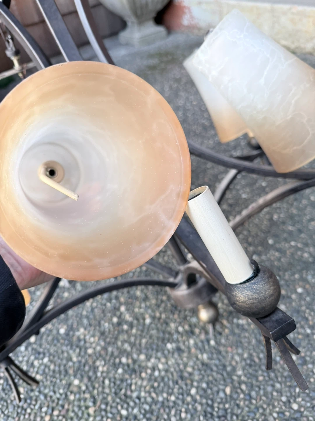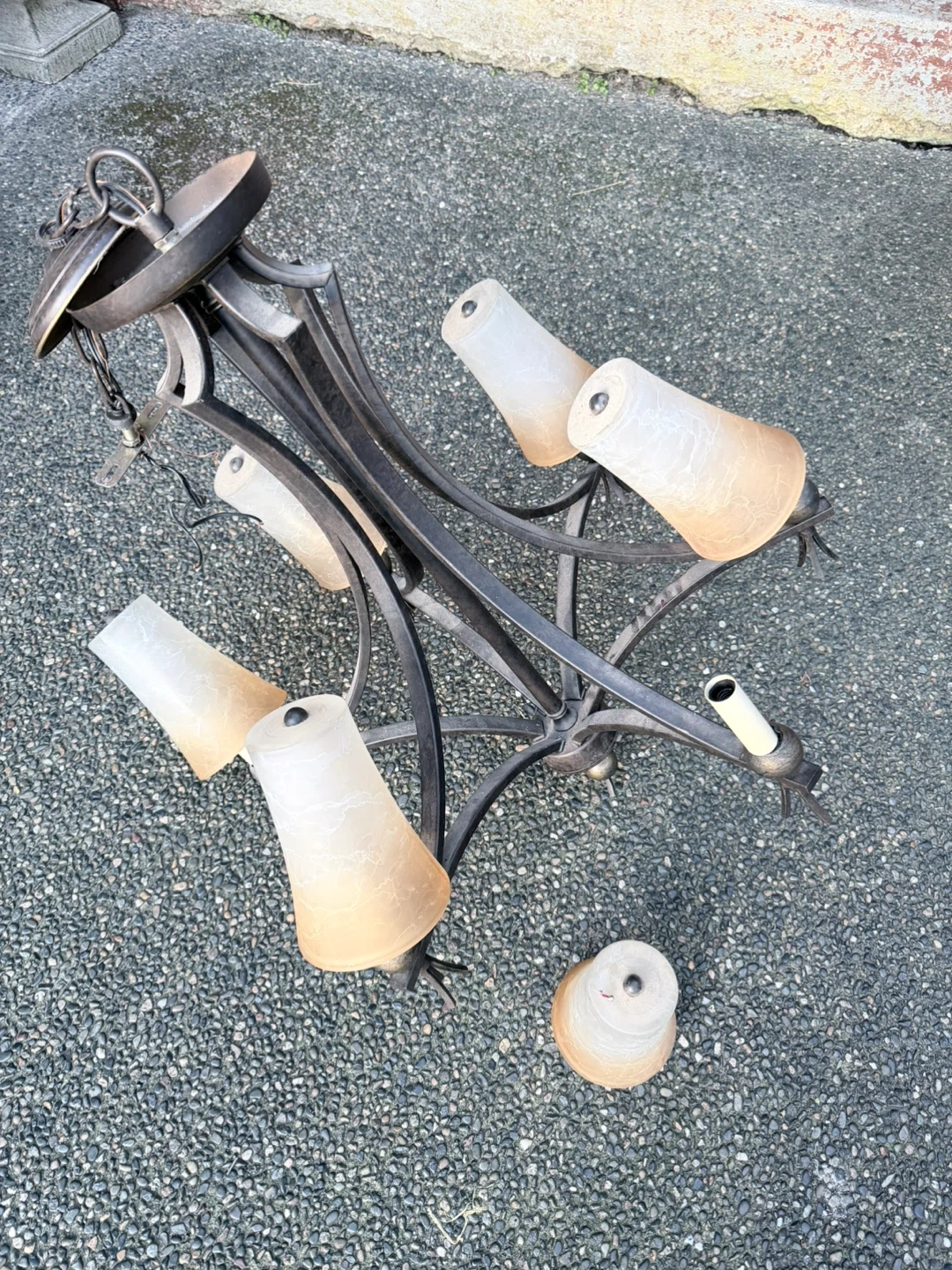 One shade needs to be soldered. chandelier lighting fixture. It features a metal frame with multiple arms extending outwards. Each arm holds a light fixture with a frosted glass shade. The shades have a marbled pattern and a warm, amber hue at the bottom, fading to white at the top. The metal frame has a dark bronze finish. Great for adding a touch of elegance to your home!