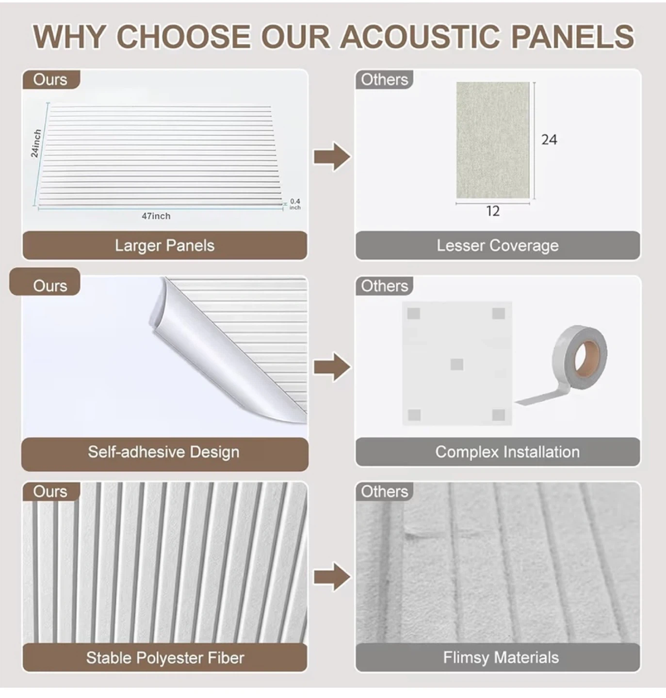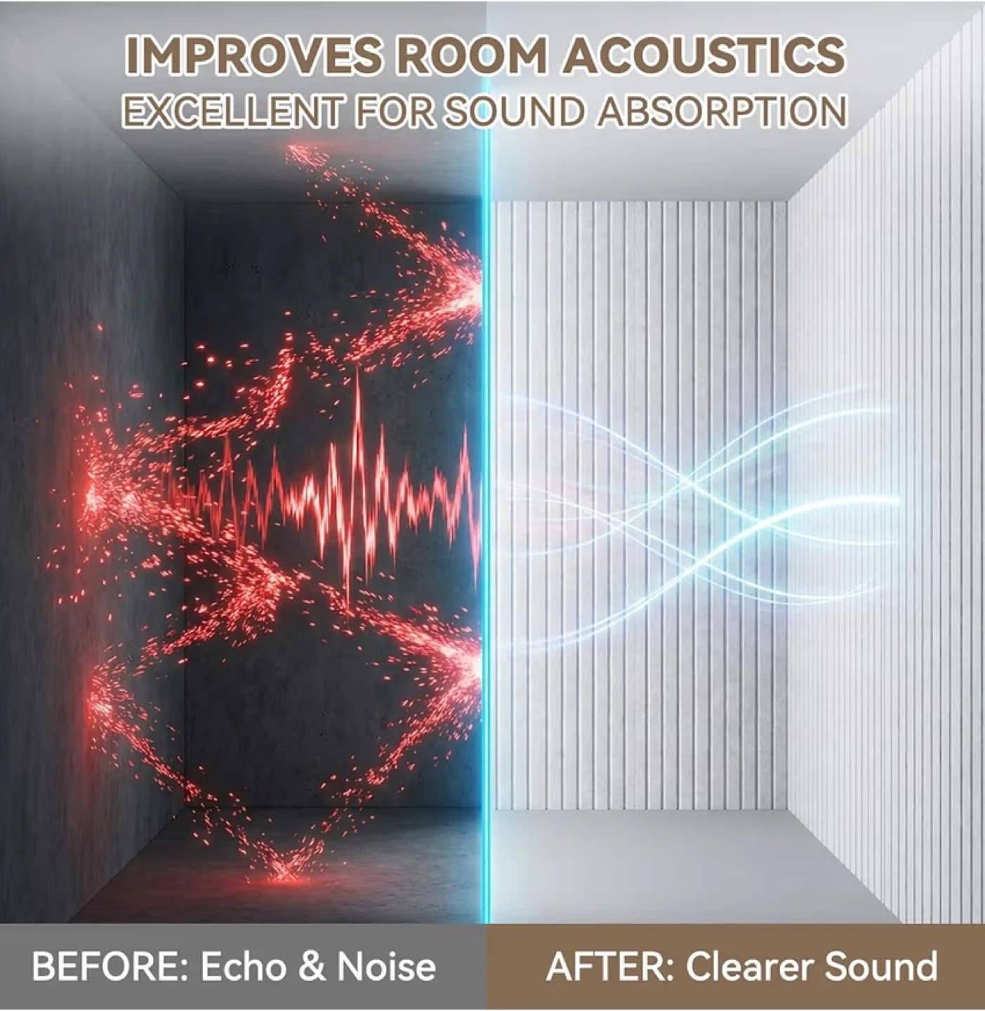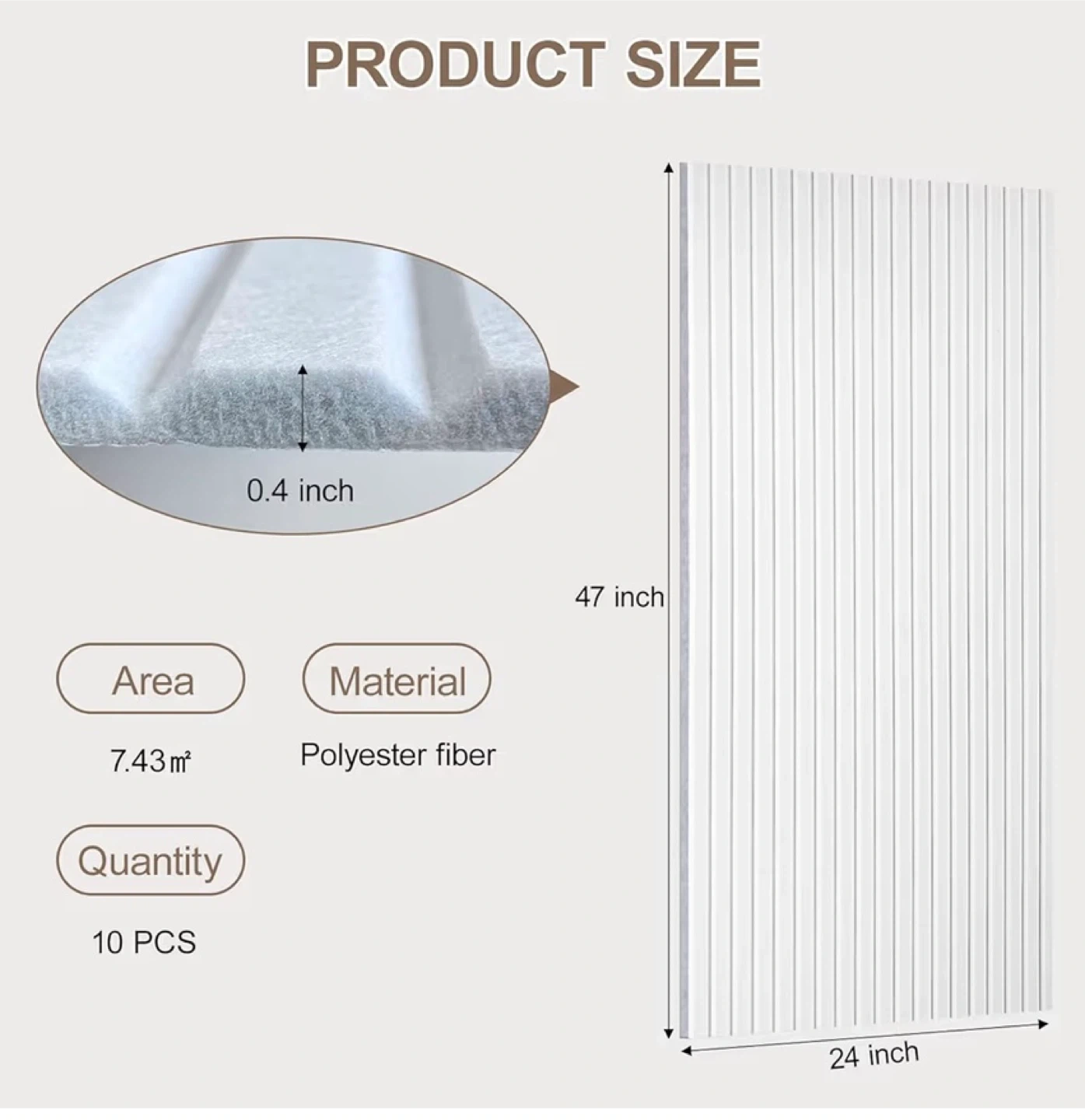 D These acoustic panels are made of polyester fiber and measure 47 inches by 24 inches. They come in a 10-pack. The panels are 0.4 inches thick and cover a total area of 7.43 m². They're excellent for sound absorption, improving room acoustics by reducing echo and noise.