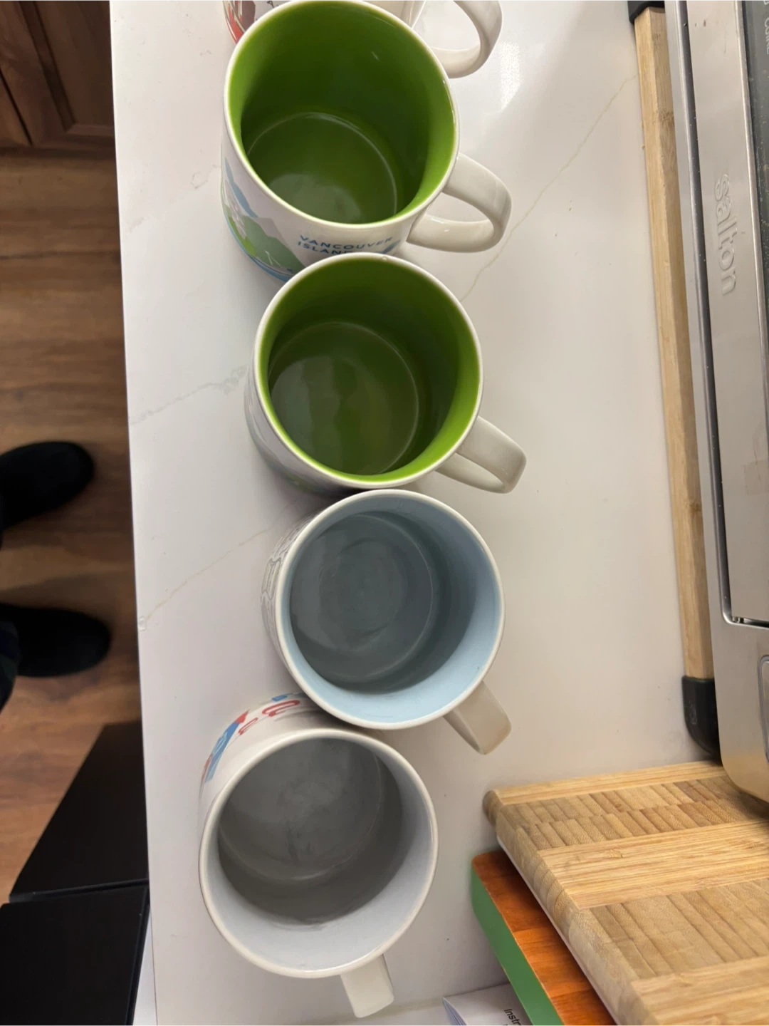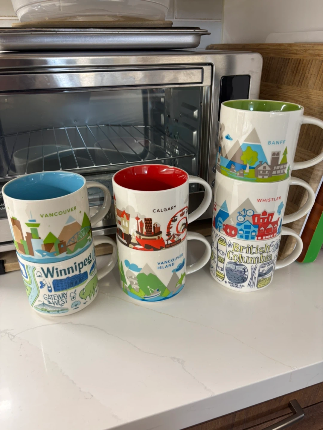 Selling a set of Starbucks city mugs! These mugs feature designs representing Vancouver, Calgary, Whistler, and Banff. They're perfect for coffee or tea, and a great way to show off your Canadian pride