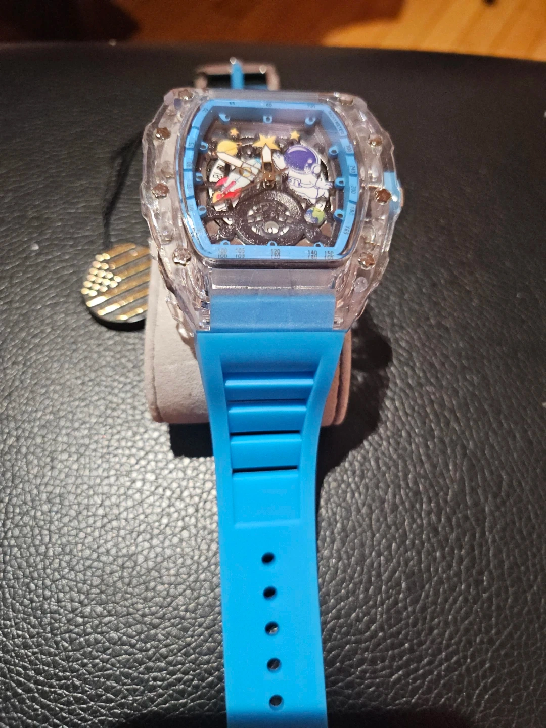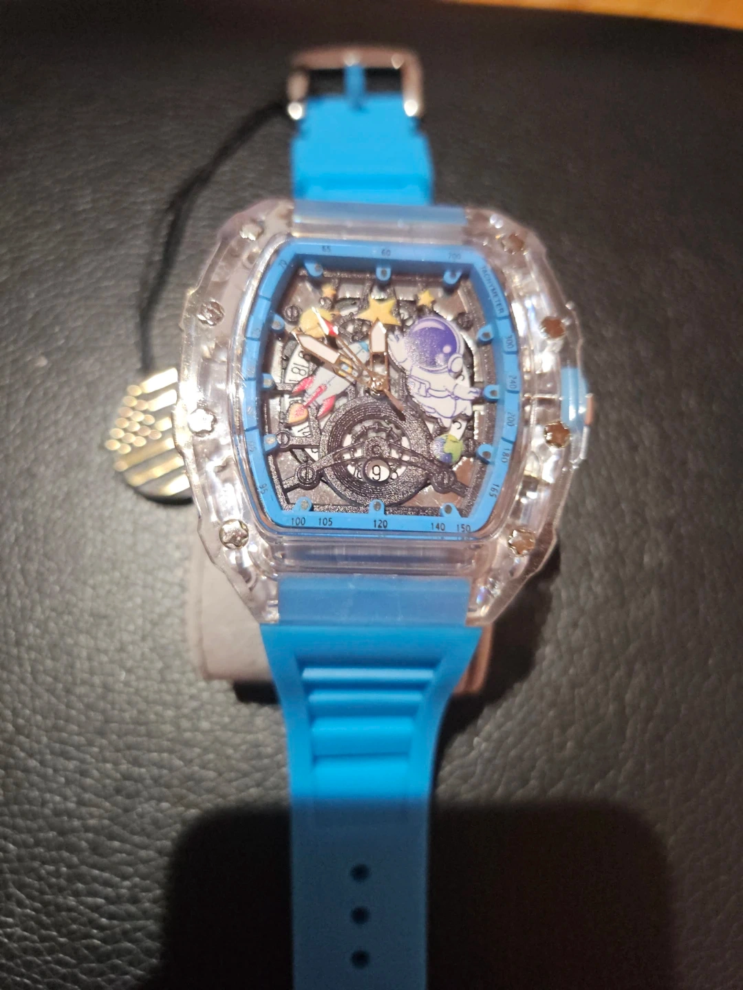Selling a unique blue wristwatch from Quality Watches USA. This watch has a distinctive design with visible gears and cartoon astronaut characters inside the watch face. It's in great condition and ready for a new owner!