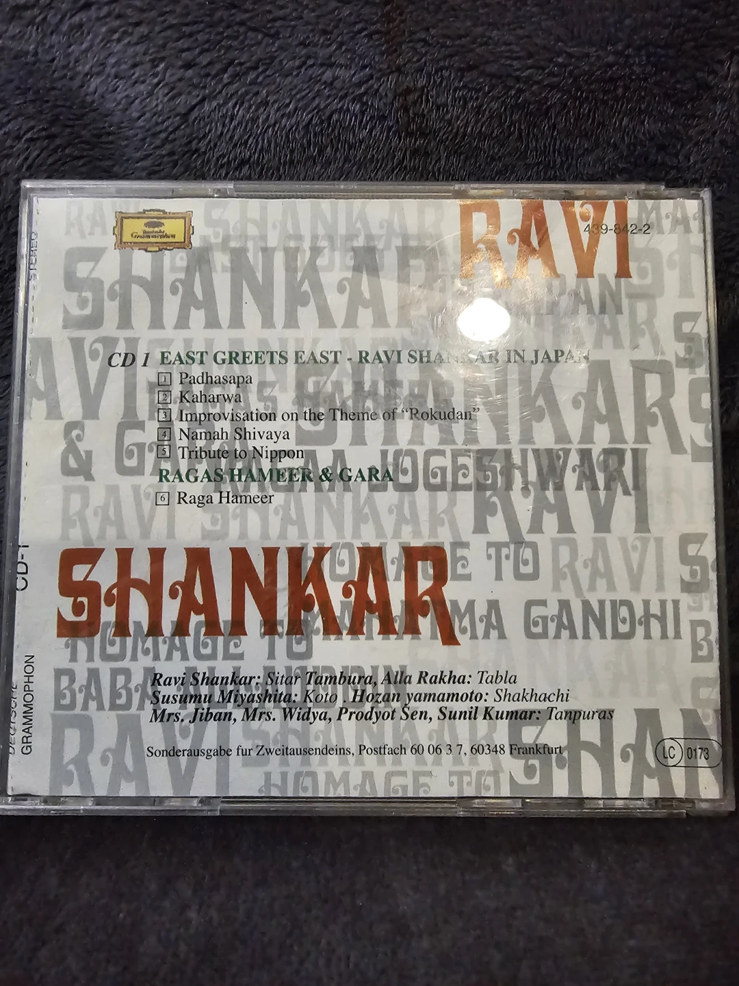 Selling a Ravi Shankar CD titled 'East Greets East'. This CD includes tracks like 'Padhasapa', 'Kaharwa', and 'Ragas Hameer & Gara'. It's a great addition for fans of Ravi Shankar's music!