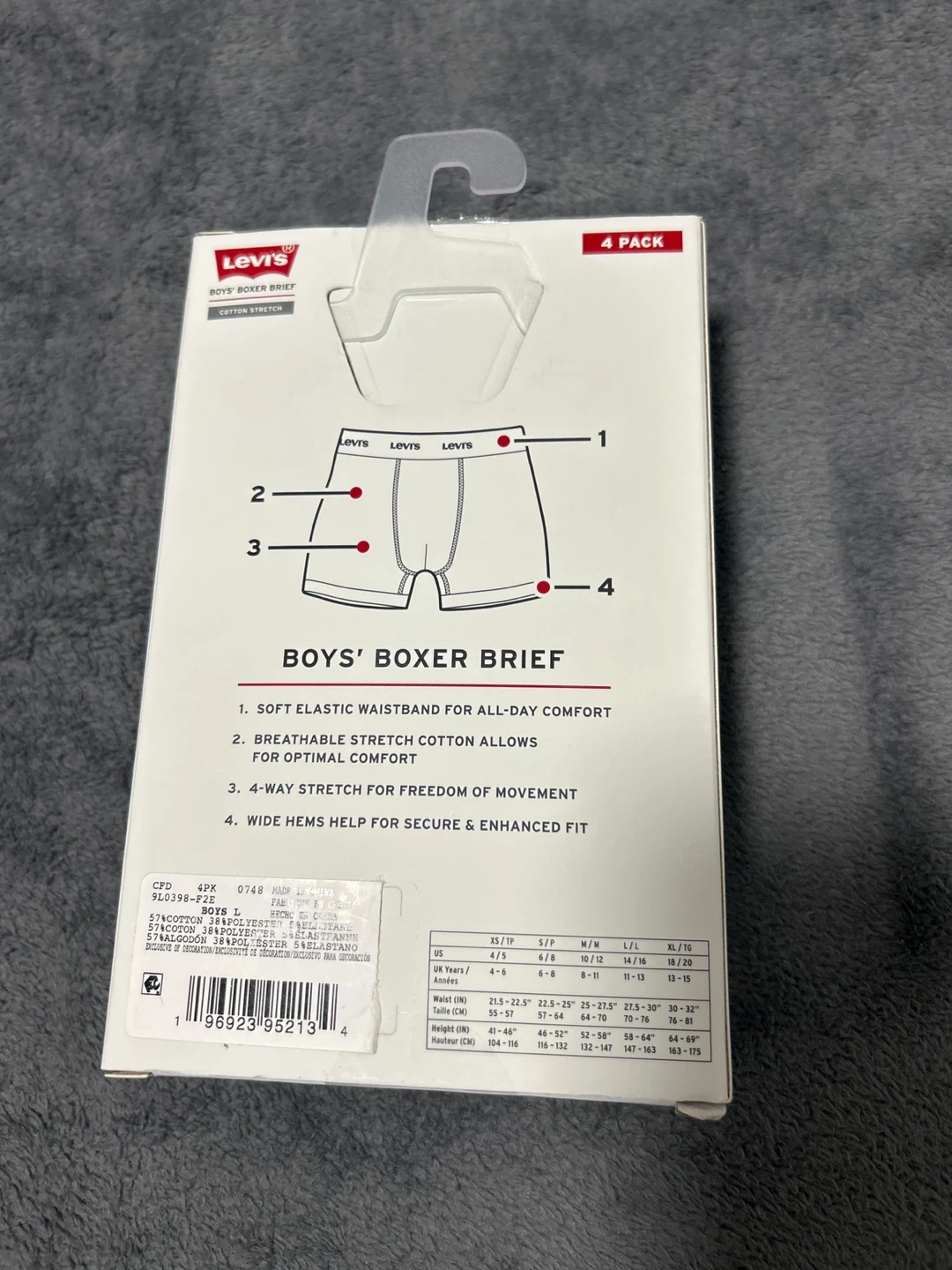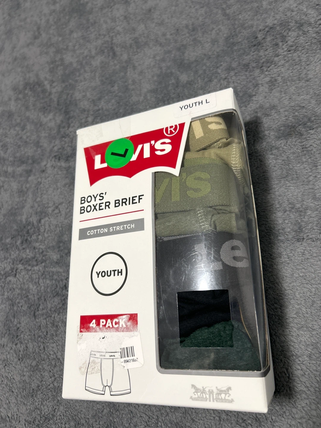 Brand new Levi's boys' boxer briefs, size youth L. This is a 4-pack of cotton stretch boxer briefs in assorted colors. The box is included! I opened the box but they're brand new, they didn't fit my son, totally new