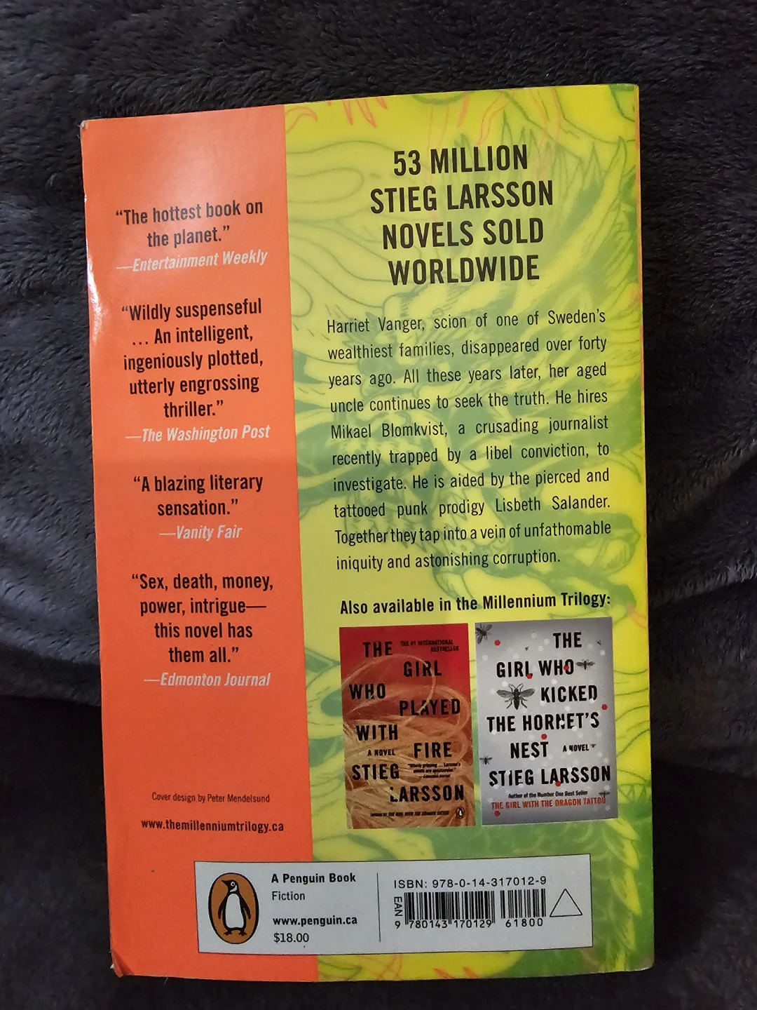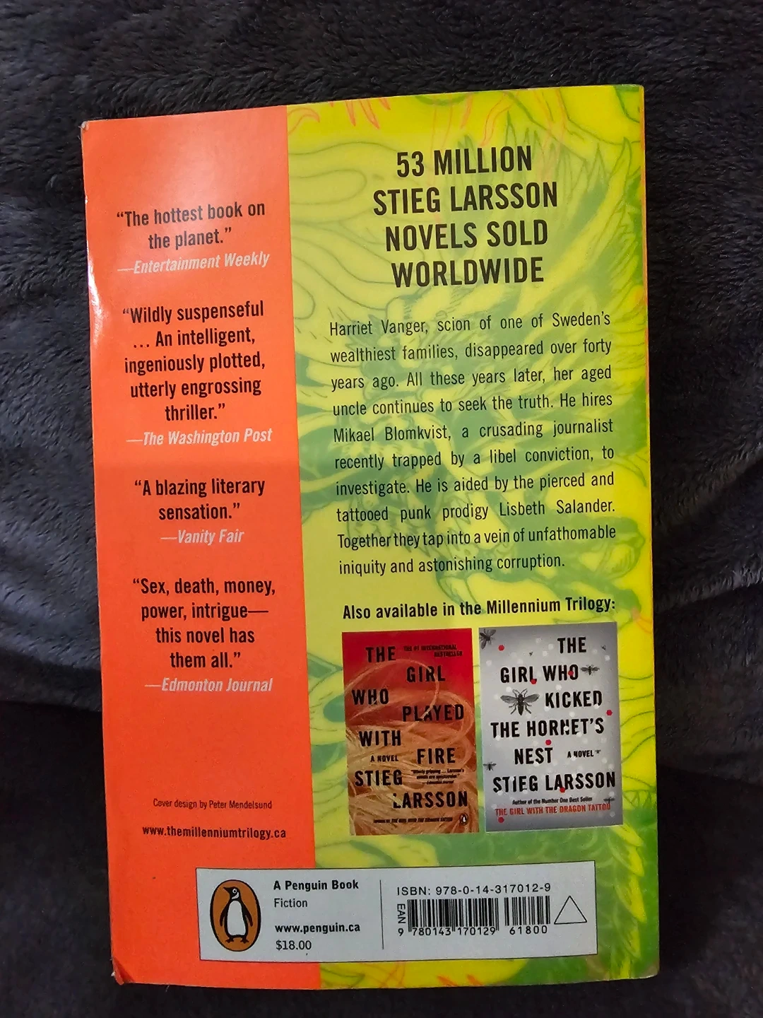 Selling "The Girl With The Dragon Tattoo" by Stieg Larsson! It's the first book in the Millennium Trilogy, a thrilling read. Perfect for anyone who enjoys suspenseful mysteries!