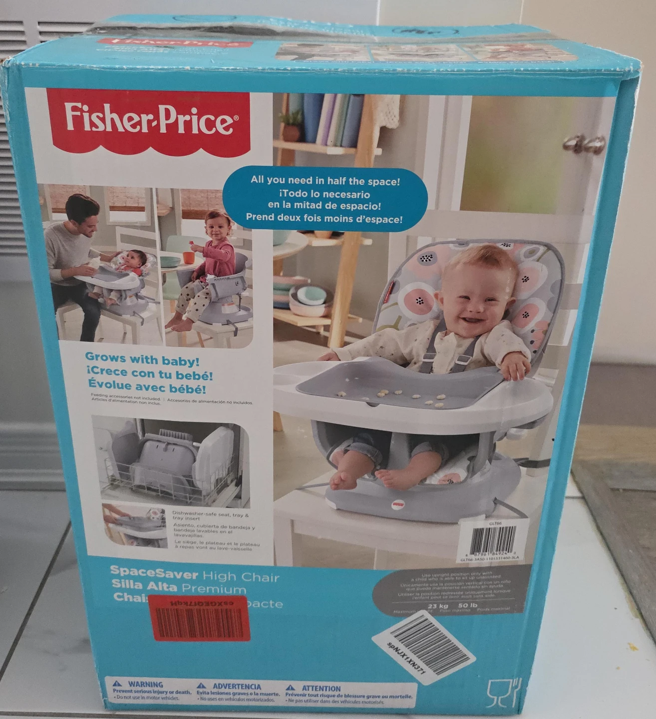 Selling a Fisher-Price SpaceSaver High Chair! It's in excellent condition and comes with the original box. This chair is designed to grow with your baby and saves space. The seat, tray, and tray insert are all dishwasher-safe, making cleanup a breeze! Perfect for little ones who are learning to sit up unassisted