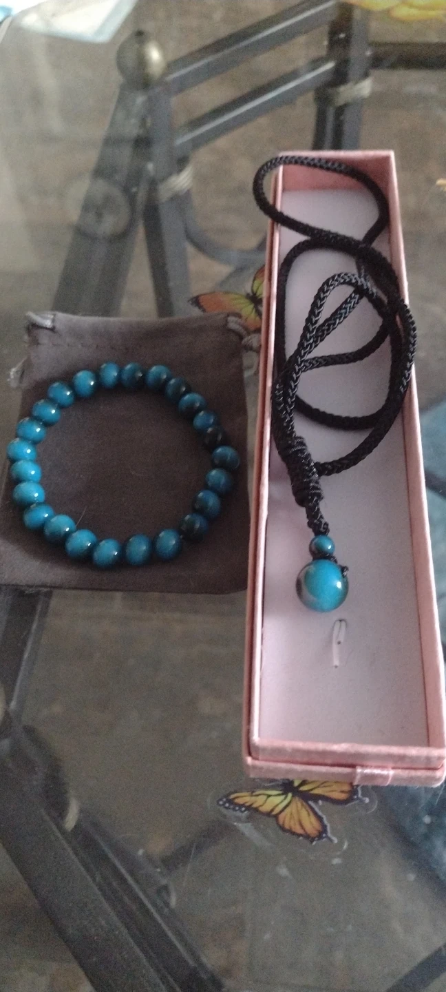 Here's a beautiful set featuring a turquoise beaded bracelet and a matching necklace! The necklace has a black cord and a single turquoise bead pendant. They come in a cute little box and pouch, perfect for gifting or keeping them safe when you're not wearing them