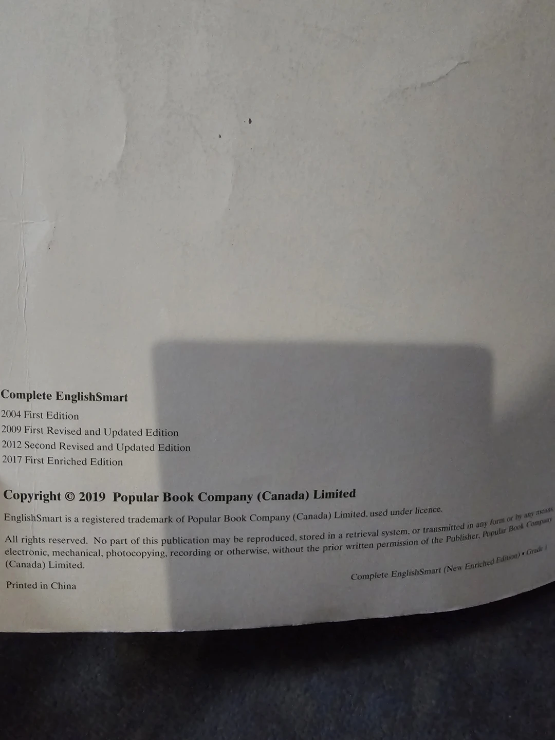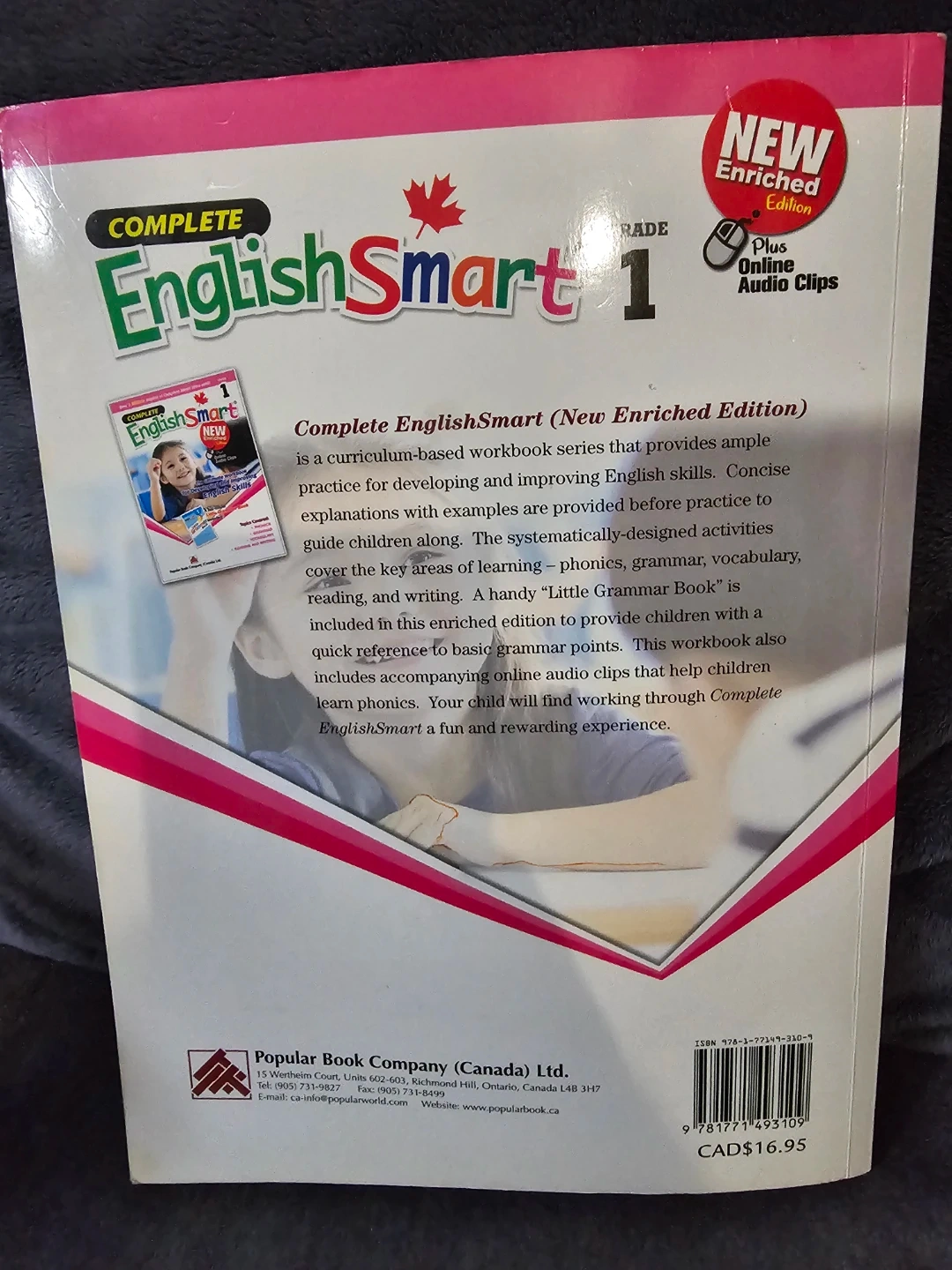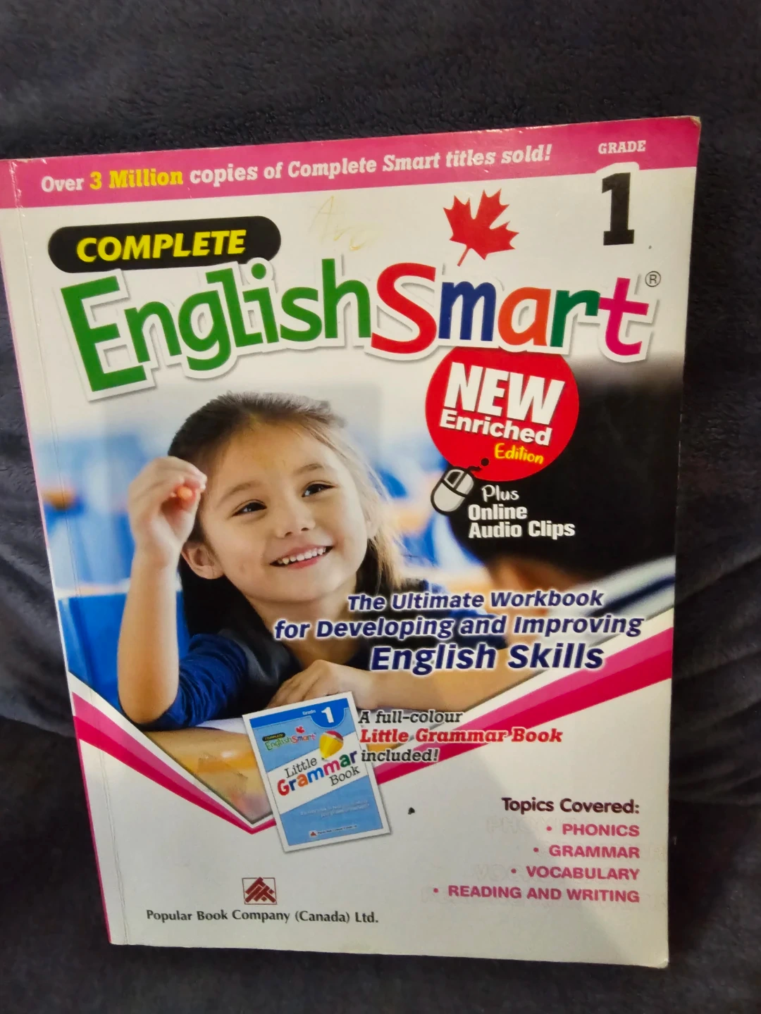I'm selling a Complete EnglishSmart 1 workbook, New Enriched Edition. It's a curriculum-based workbook series that provides ample practice for developing and improving English skills. Concise explanations with examples are provided for practice to guide children along. The systematically-designed activities cover the key areas of learning - phonics, grammar, vocabulary, reading, and writing. A handy "Little Grammar Book" is included in this enriched edition to provide children with a quick reference to basic grammar points. This workbook also includes accompanying online audio clips that help children learn phonics. Your child will find working through Complete EnglishSmart a fun and rewarding experience
