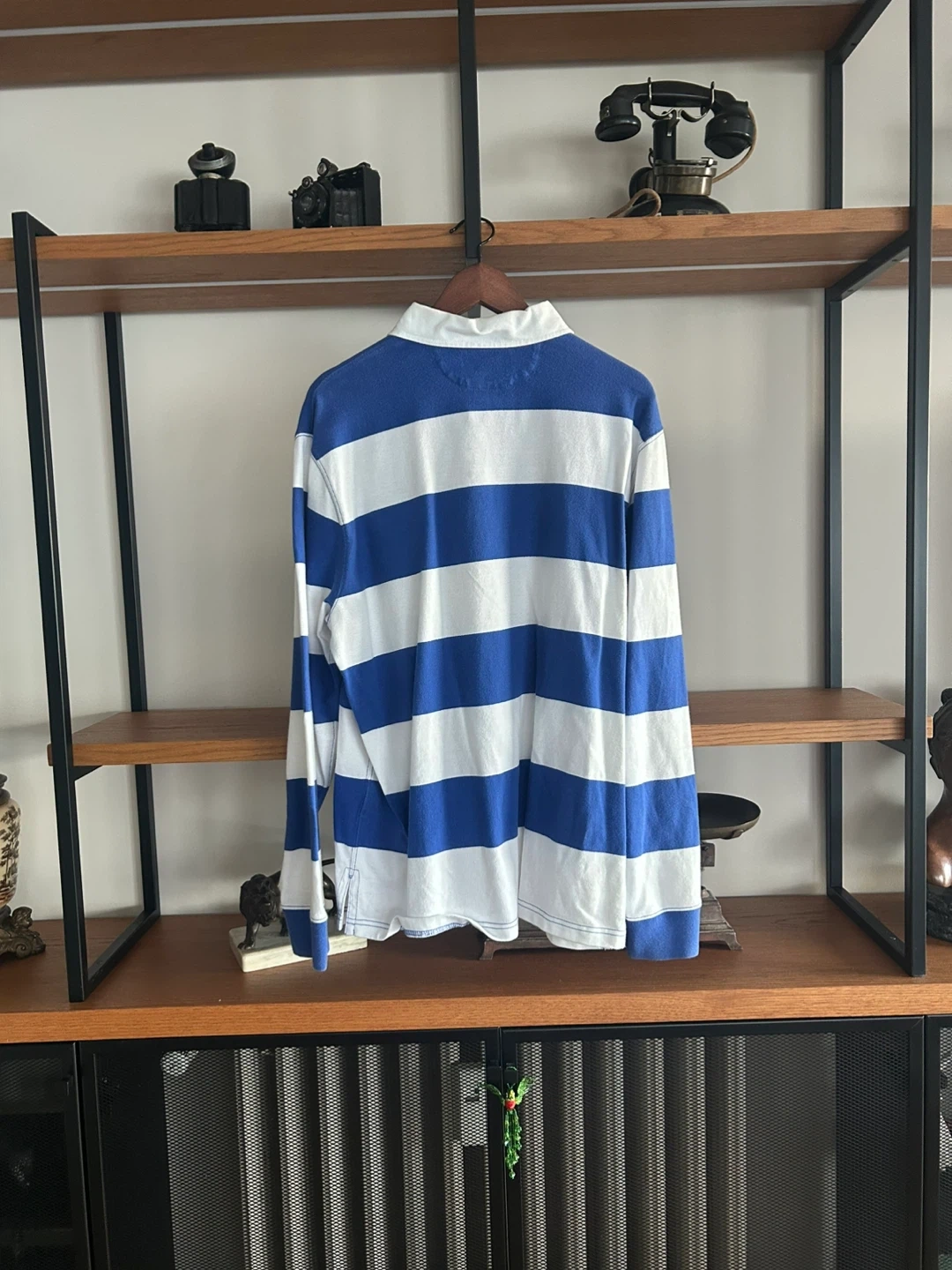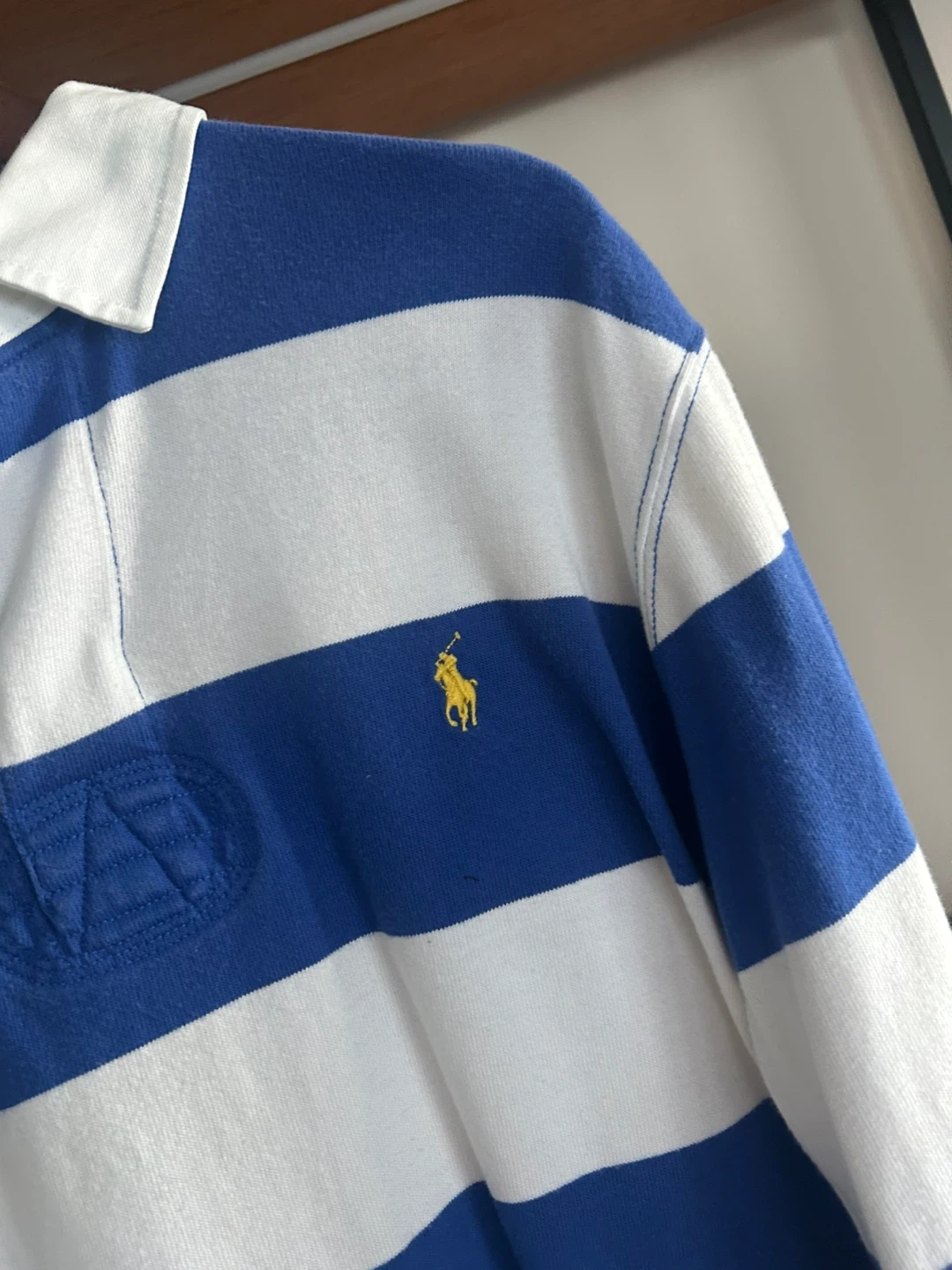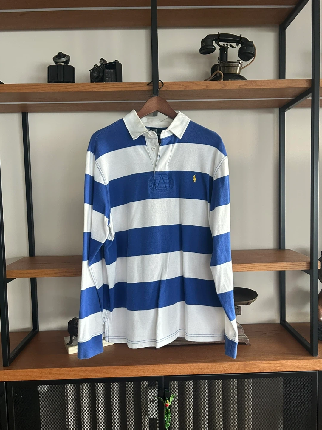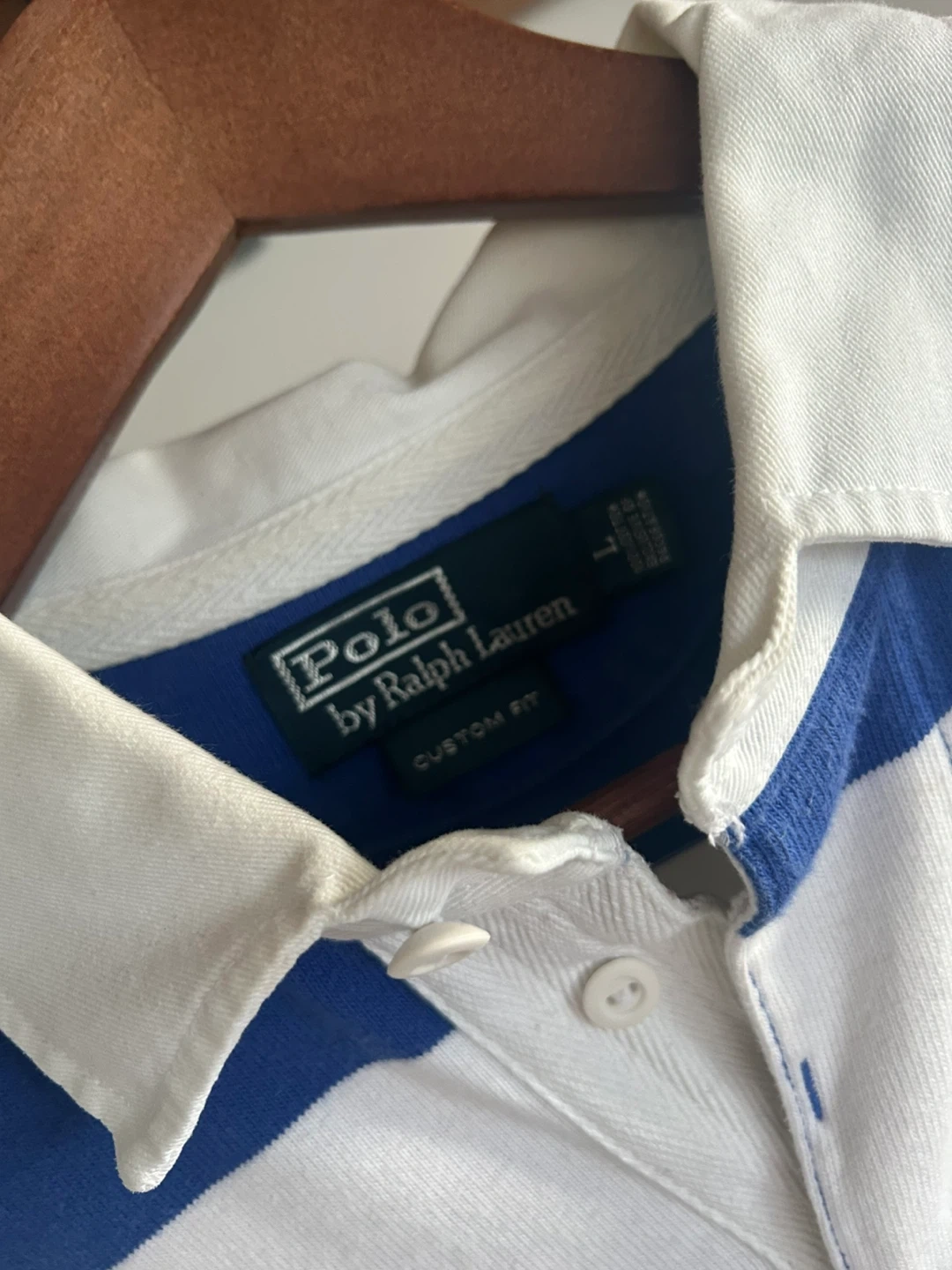 Here's a classic Polo by Ralph Lauren rugby shirt! It features a blue and white striped pattern and is a size L. It's in great condition and ready for a new home!