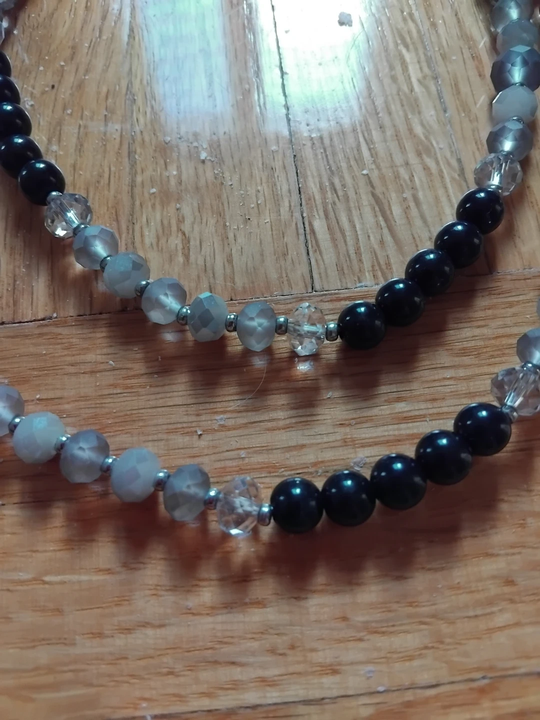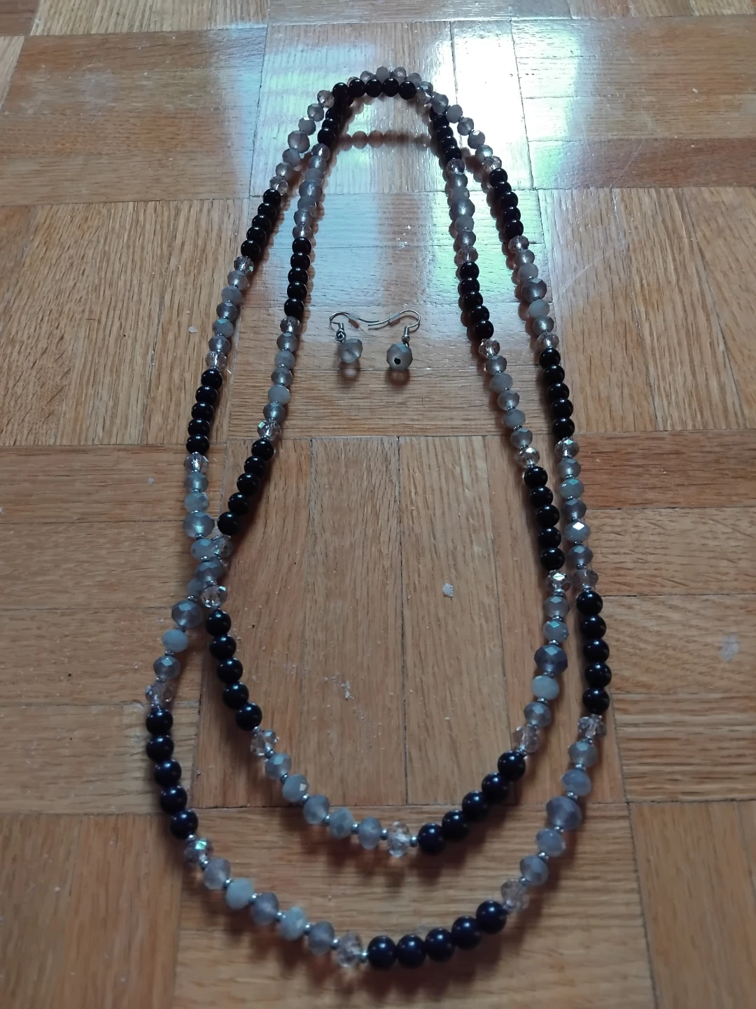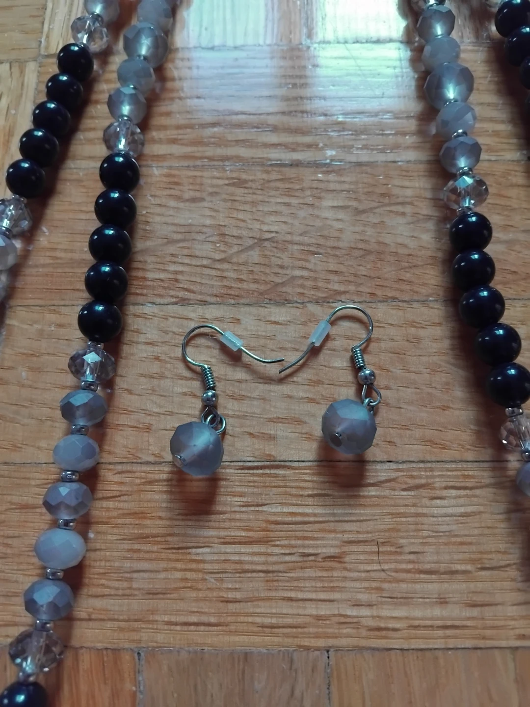 Here's a lovely beaded necklace with matching earrings. The beads are a mix of black, grey, and clear. They would make a great addition to any outfit!