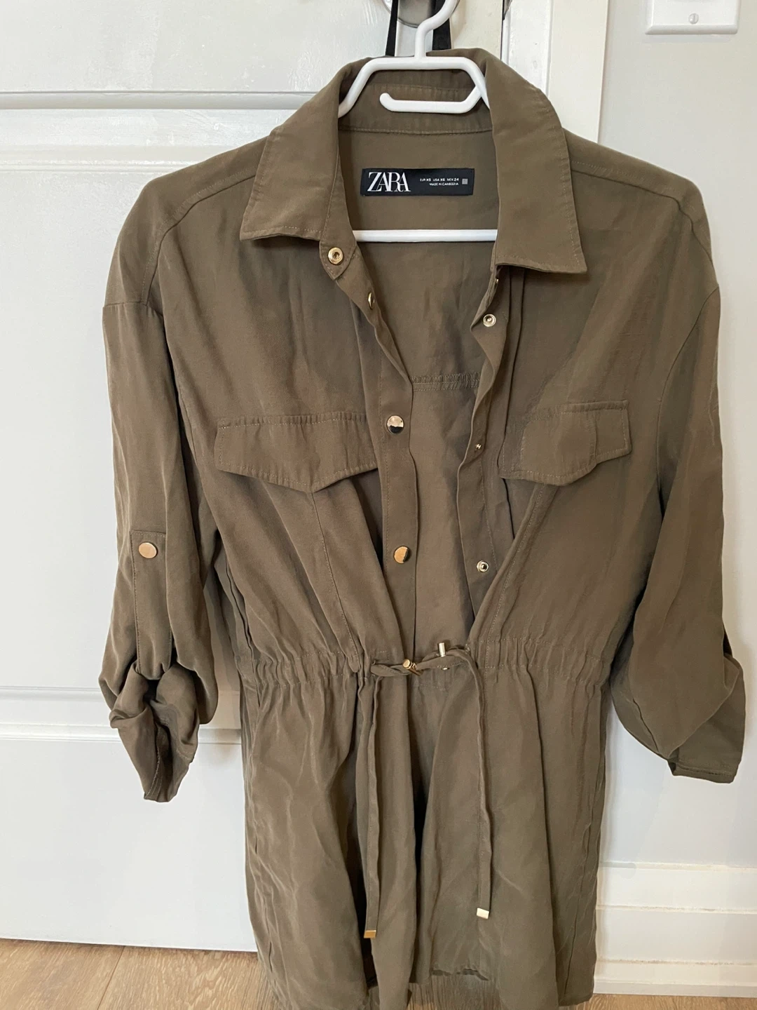 Selling a Zara dress shirt in olive green. It's a size small and in great condition. Perfect for a casual or dressed-up look!