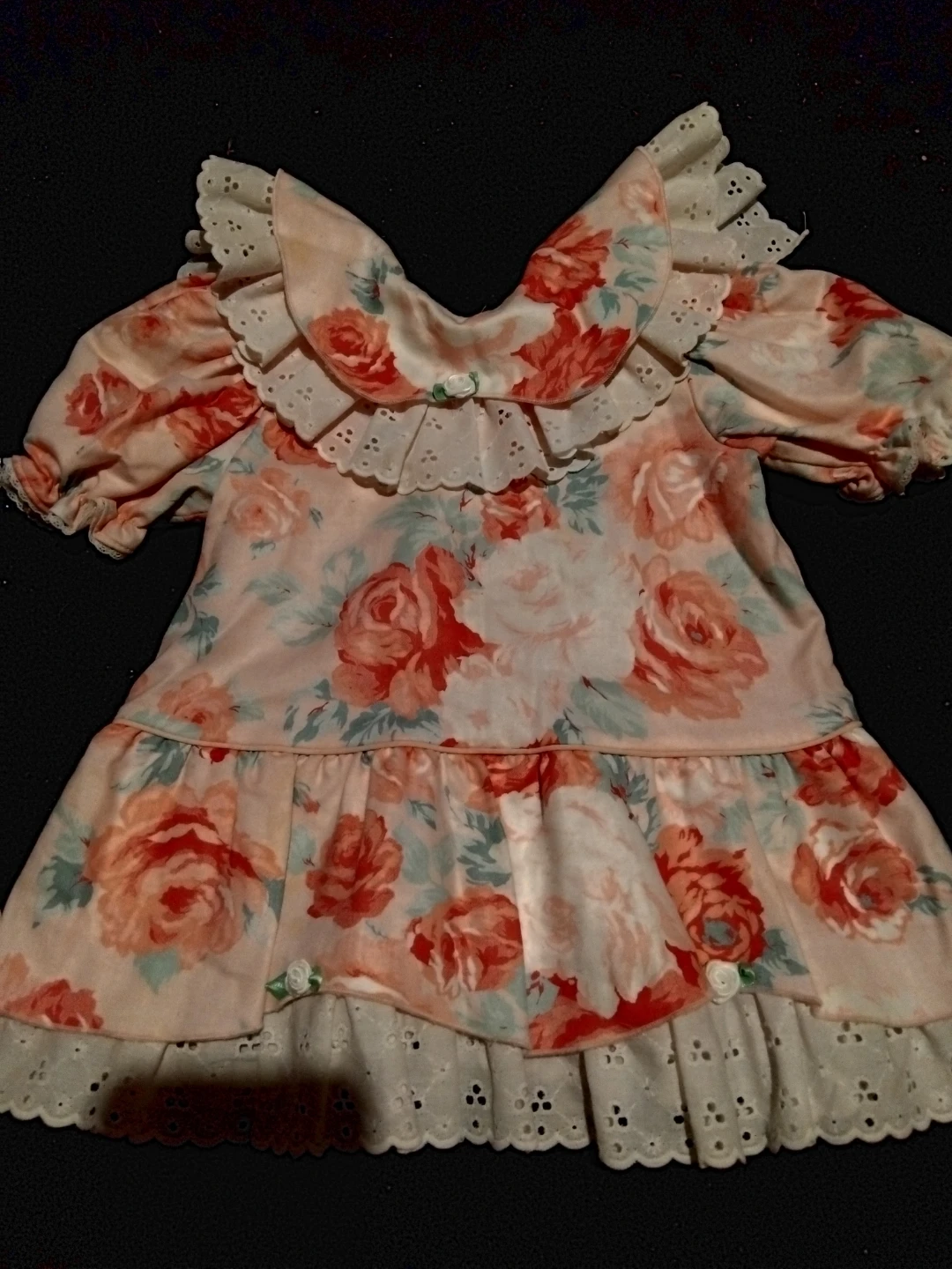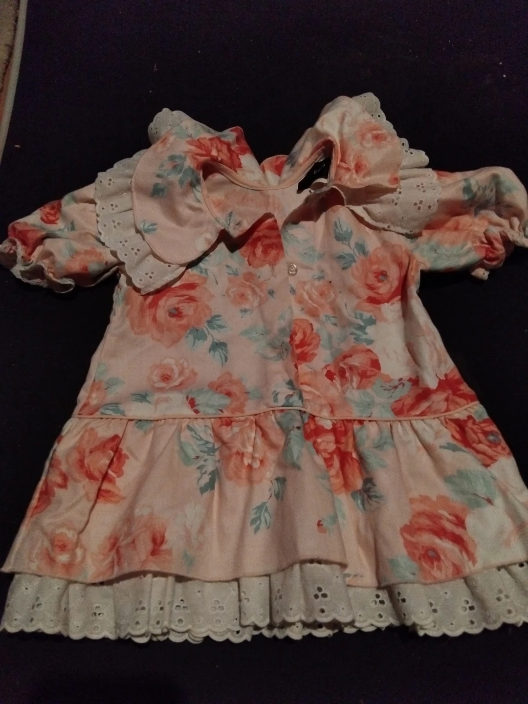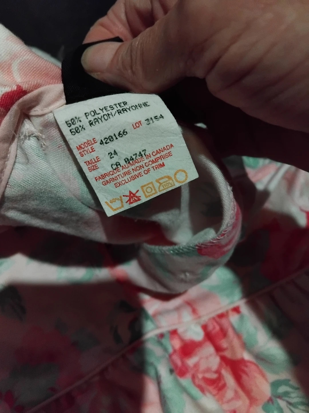 Super cute floral dress in size 24! The dress is made of 50% polyester and 50% rayon. It features a lovely floral pattern and a ruffled collar and hem. Perfect for a special occasion or just a fun day out
