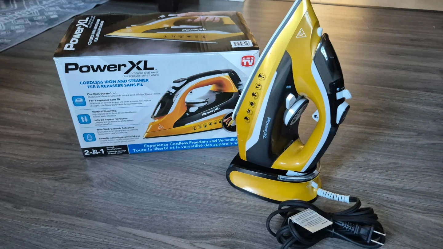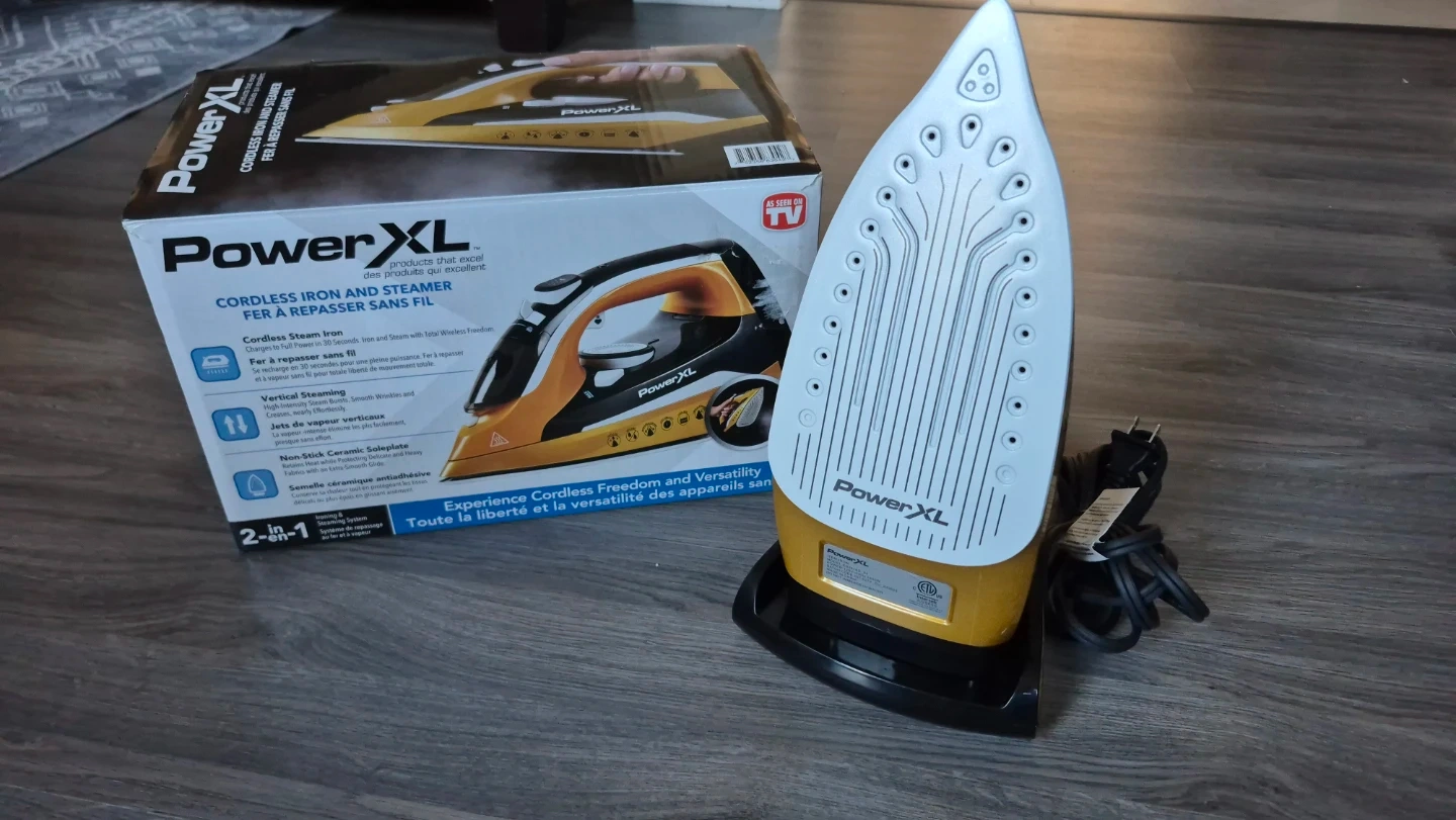 I'm selling a PowerXL Cordless Iron and Steamer! It's a 2-in-1 appliance, so it can be used as both an iron and a steamer. It heats up quickly in 30 seconds and works cordlessly, giving you freedom of movement. It also has vertical steaming capabilities and a non-stick ceramic soleplate. Comes with the box!