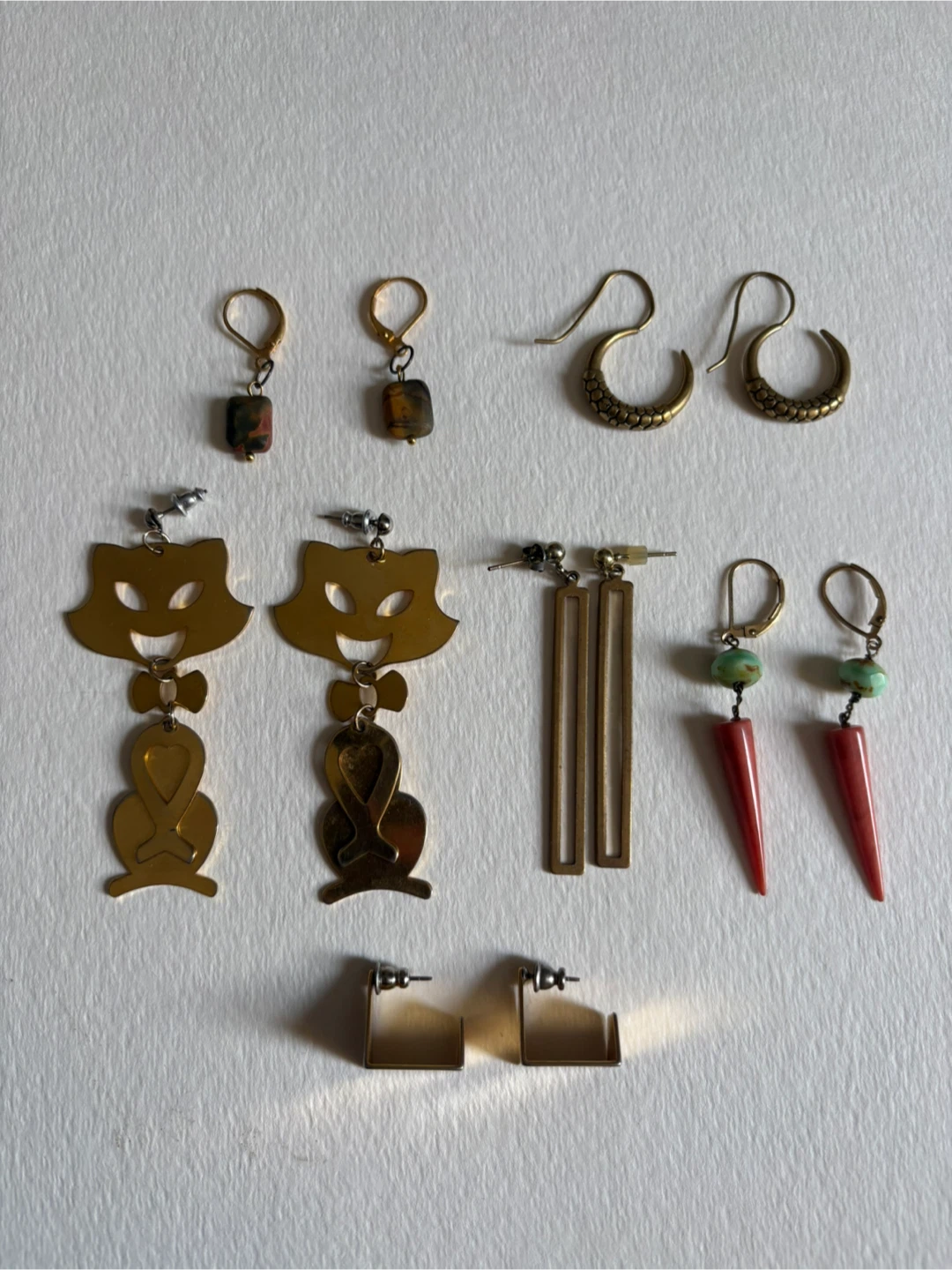 A collection of earrings in various gold tones! There are several different styles to choose from, including geometric shapes and some with colourful accents. Perfect for adding a touch of sparkle to any outfit