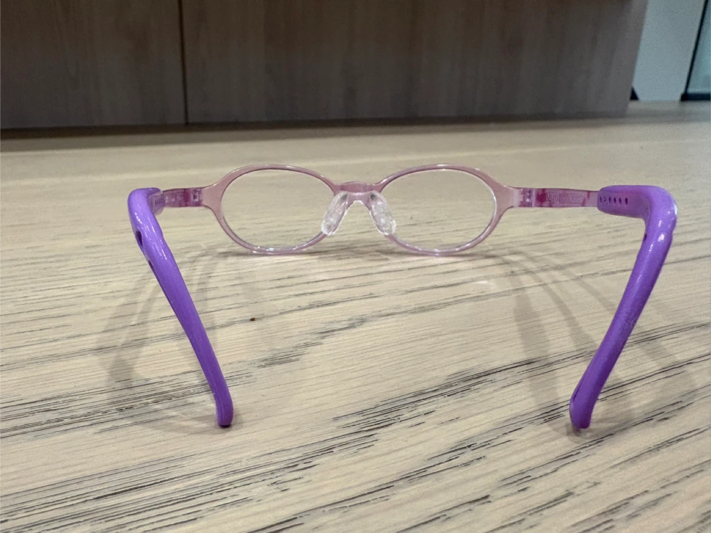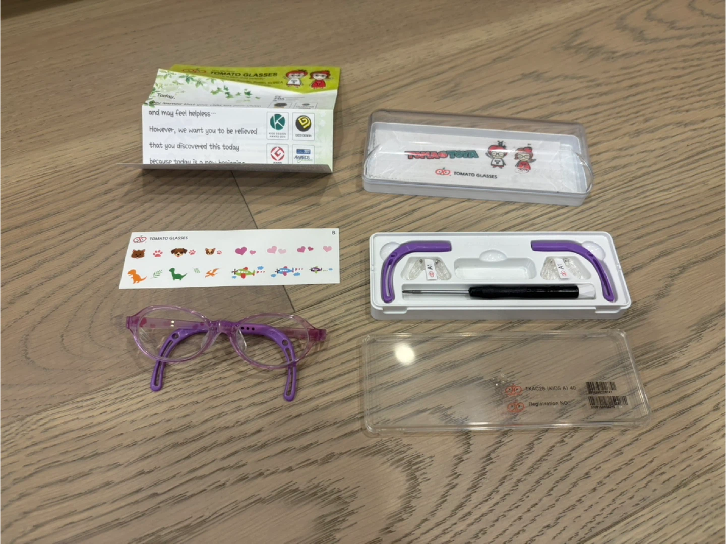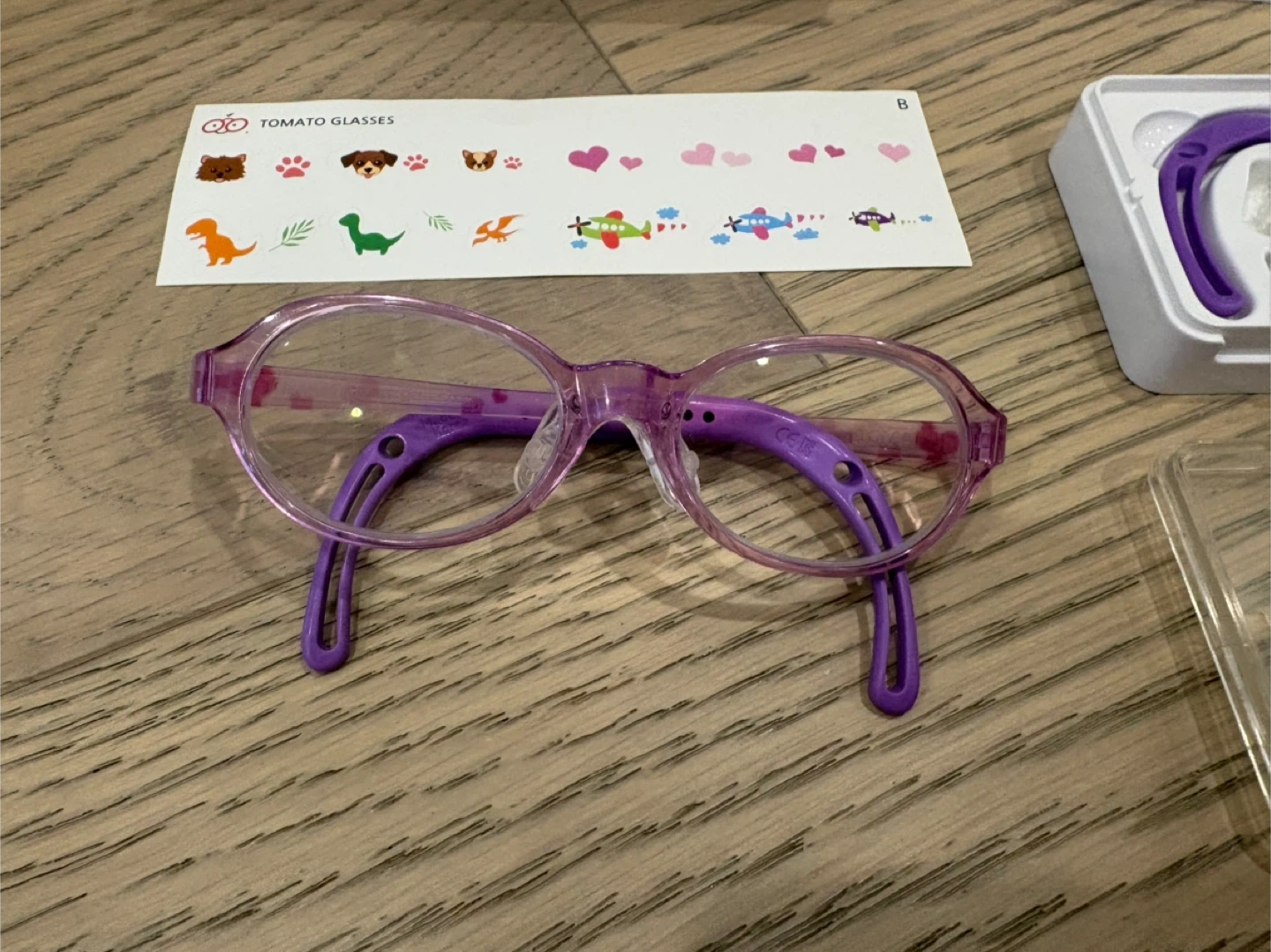 These Tomato Glasses are in good used condition and ready for a new kiddo! They come with the original box, stickers, and a screwdriver for adjustments. The frame is a lovely purple colour with heart details on the sides. Ages 2 -5 depending on child’s head size.