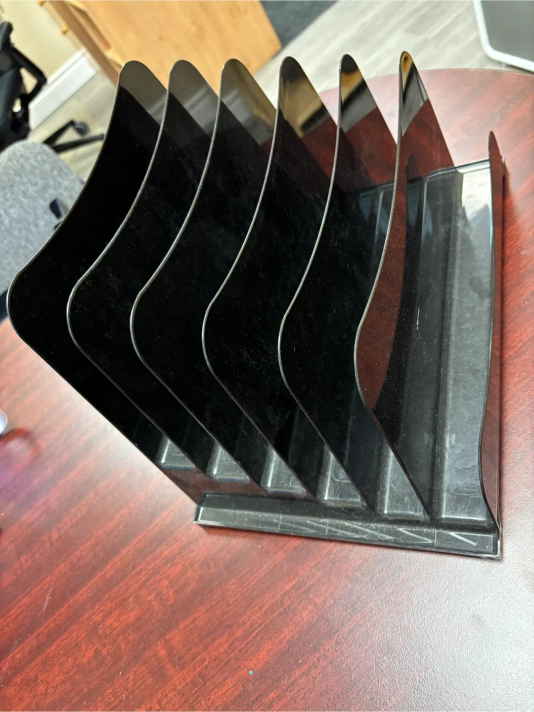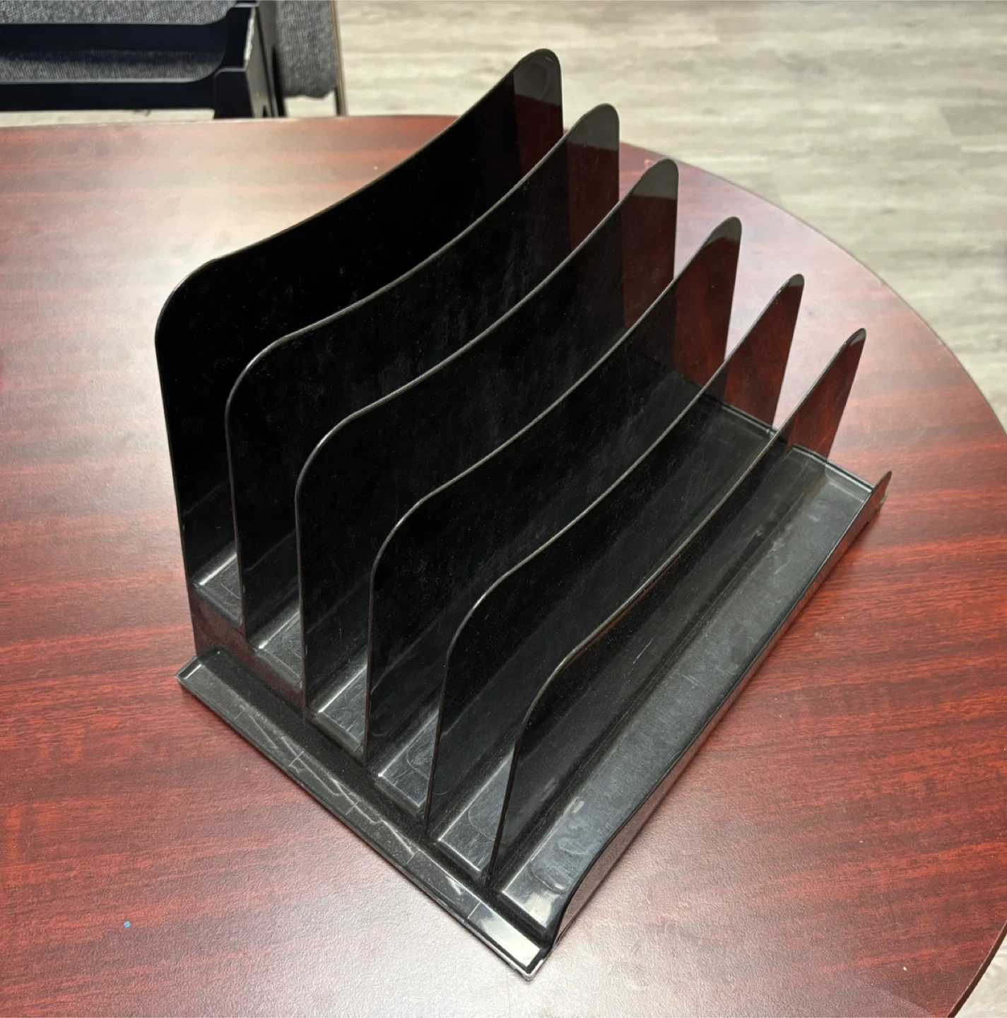 Declutter your workspace with this handy black plastic desk file organizer! It's perfect for keeping your documents and papers neatly arranged. This organizer features multiple slots to separate files and keep your desk tidy. It's in great condition and ready to help you stay organized