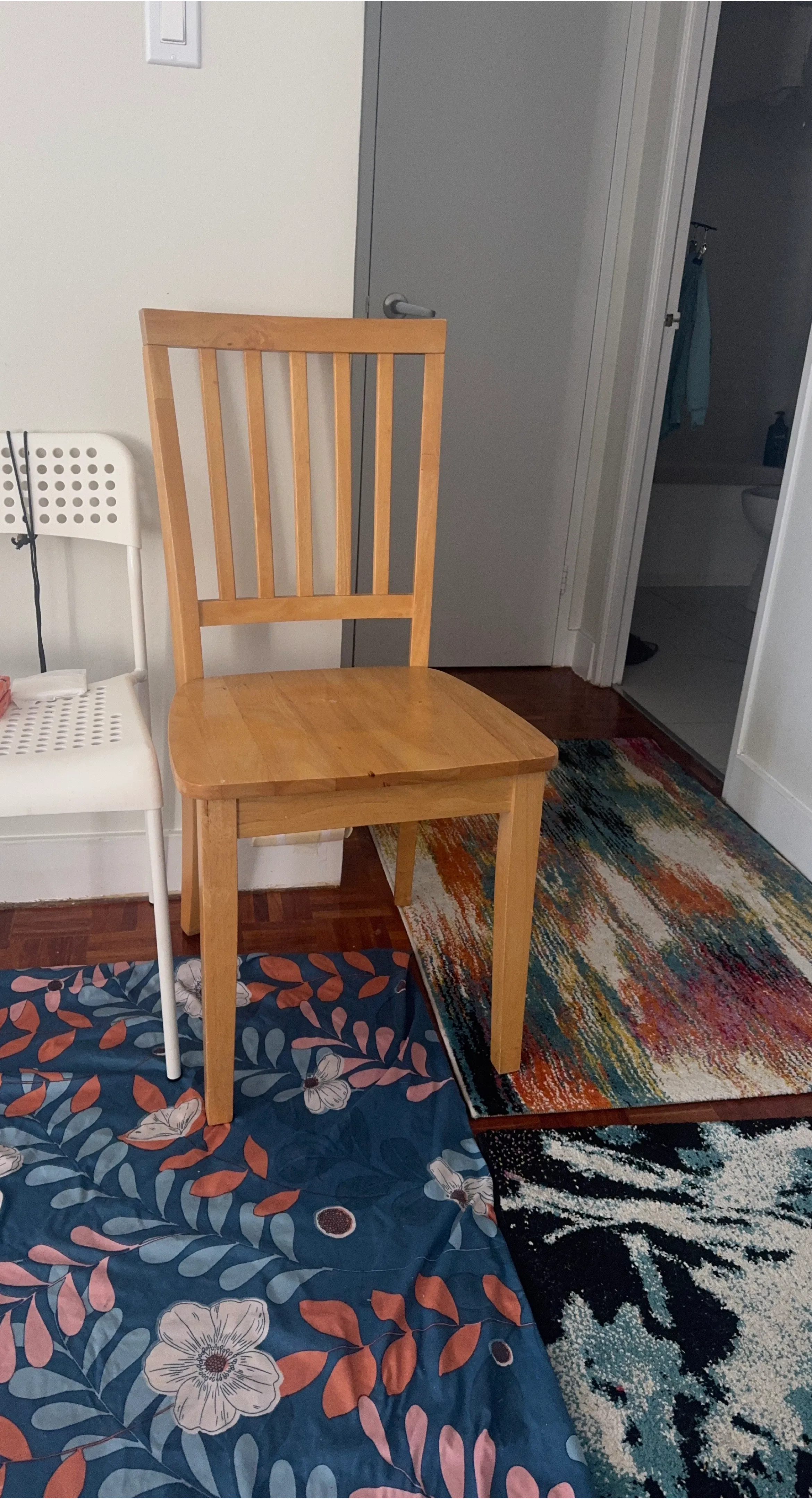 Selling a wooden dining chair in good condition. It's a sturdy chair that would look great in any dining room or kitchen. It has a classic design with vertical slats in the backrest. The chair is made of light-colored wood.