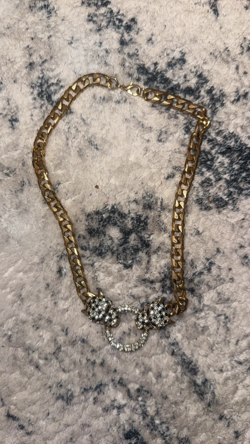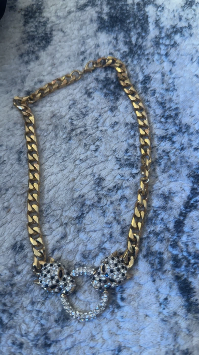 Here's a gold tone chain necklace featuring leopard heads adorned with rhinestones! It's a unique and eye-catching piece that would add a touch of boldness to any outfit