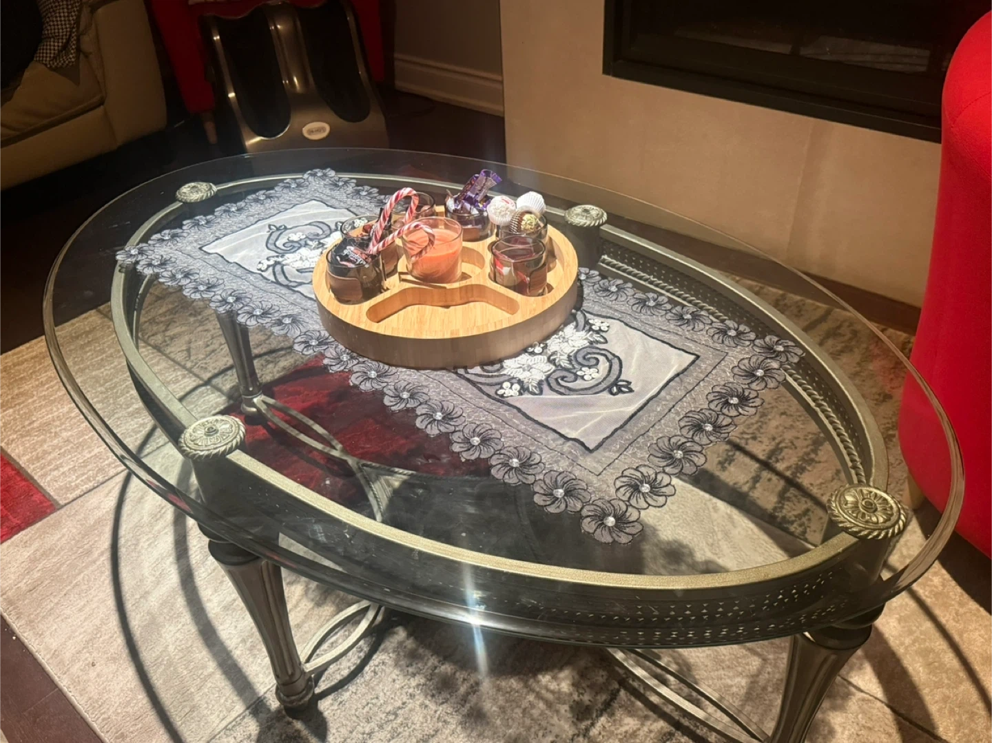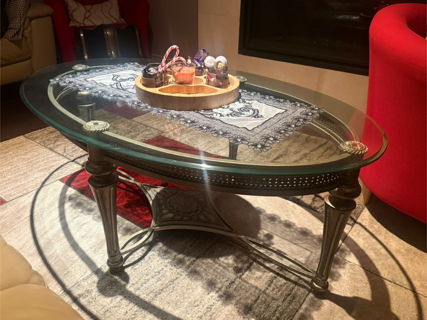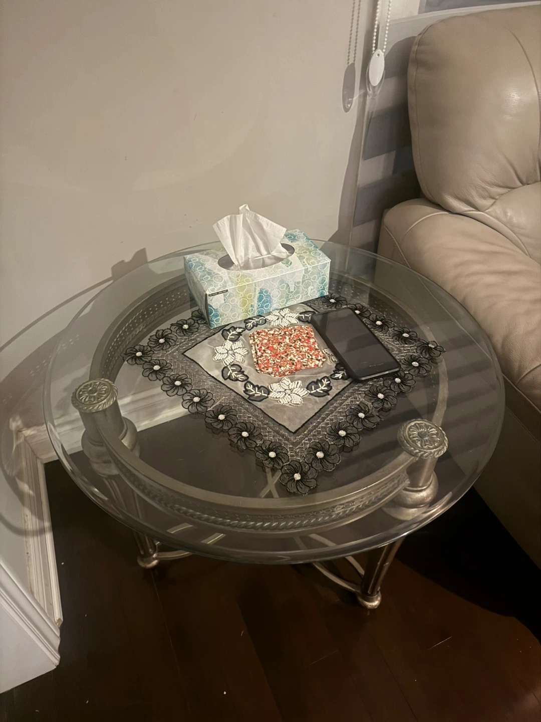Selling a glass top coffee table and end table. It has a metal frame with decorative accents. The table is in good condition and would be a great addition to any living room!