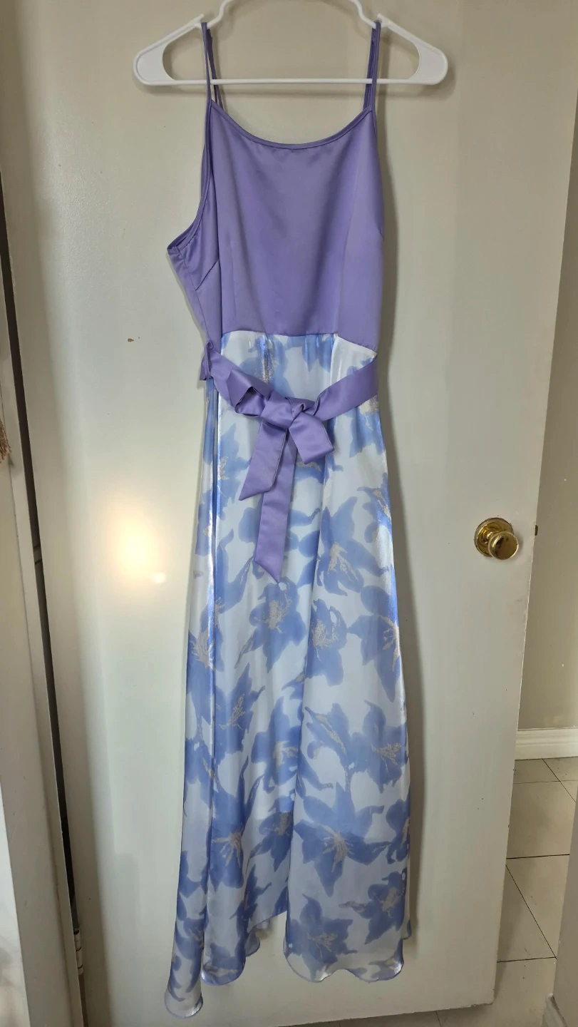 Selling a lovely floral maxi dress in size XL (12). The dress features a light purple top and a beautiful blue and white floral print on the skirt. It also has a matching belt to cinch the waist. Perfect for summer or a special occasion! Wedding guest!