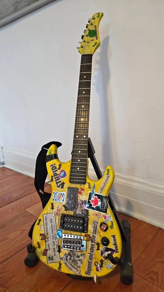 This is not your average guitar store find. It features a heavy yellow "crackle" finish, custom stickers, and a serious punk/grunge aesthetic. It looks like a "Super Strat" style body with dual humbucker pickups.