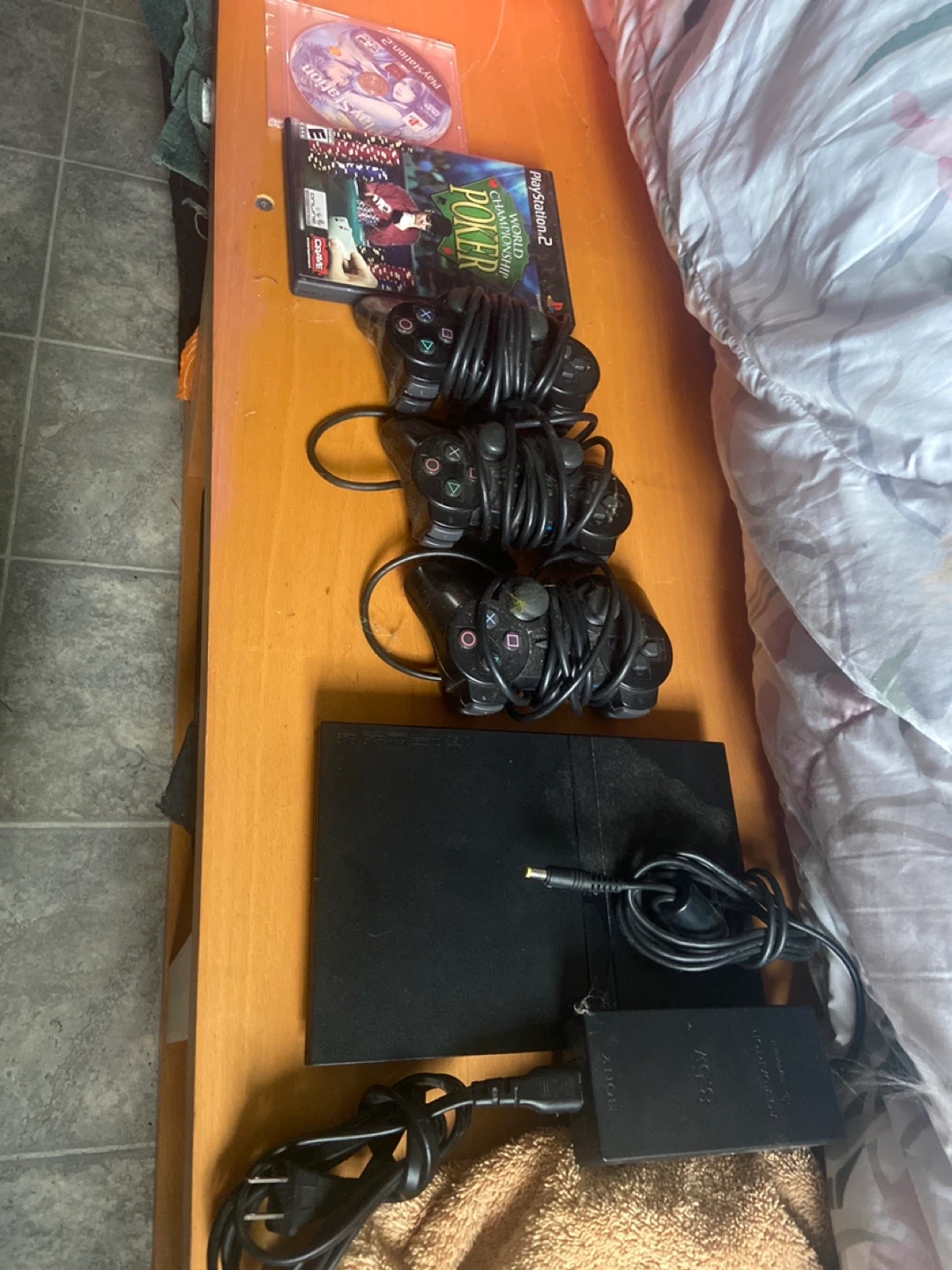 Selling a PlayStation 2 console. It comes with three controllers, the power cable, and two games: Championship Poker and another game disc. Needing AV Cord!