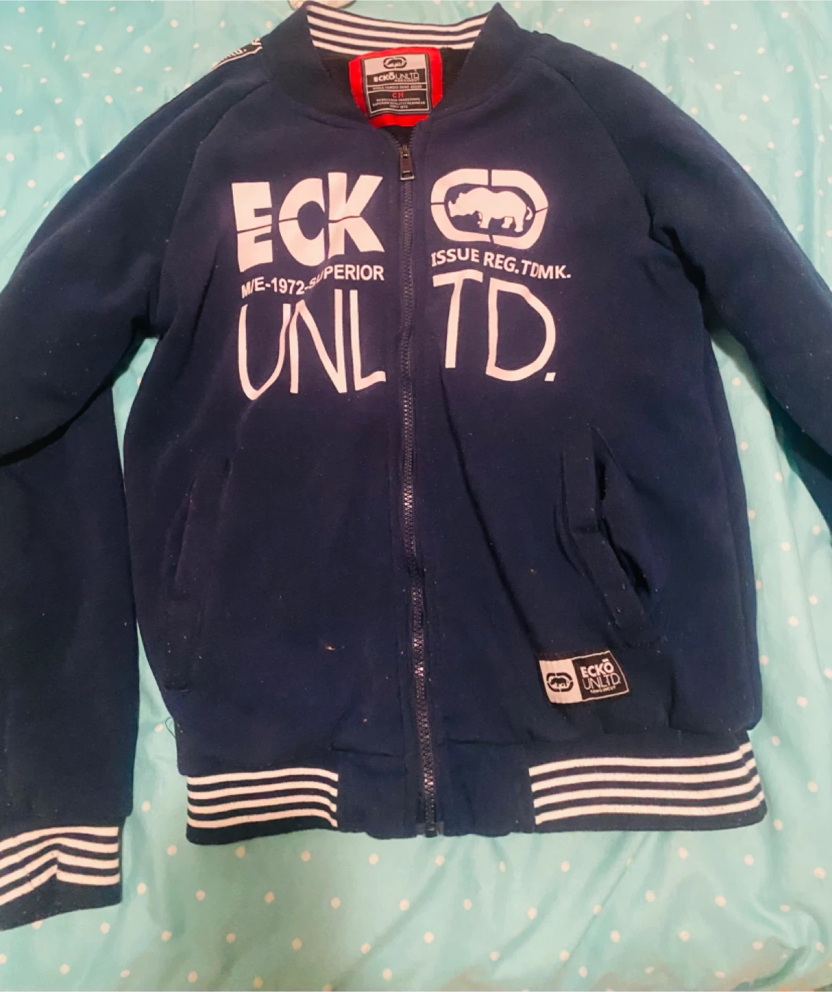 Selling a navy blue Ecko Unltd. bomber jacket! It features the brand's logo prominently on the front, along with striped detailing on the cuffs and collar. A stylish and comfortable jacket for everyday wear!