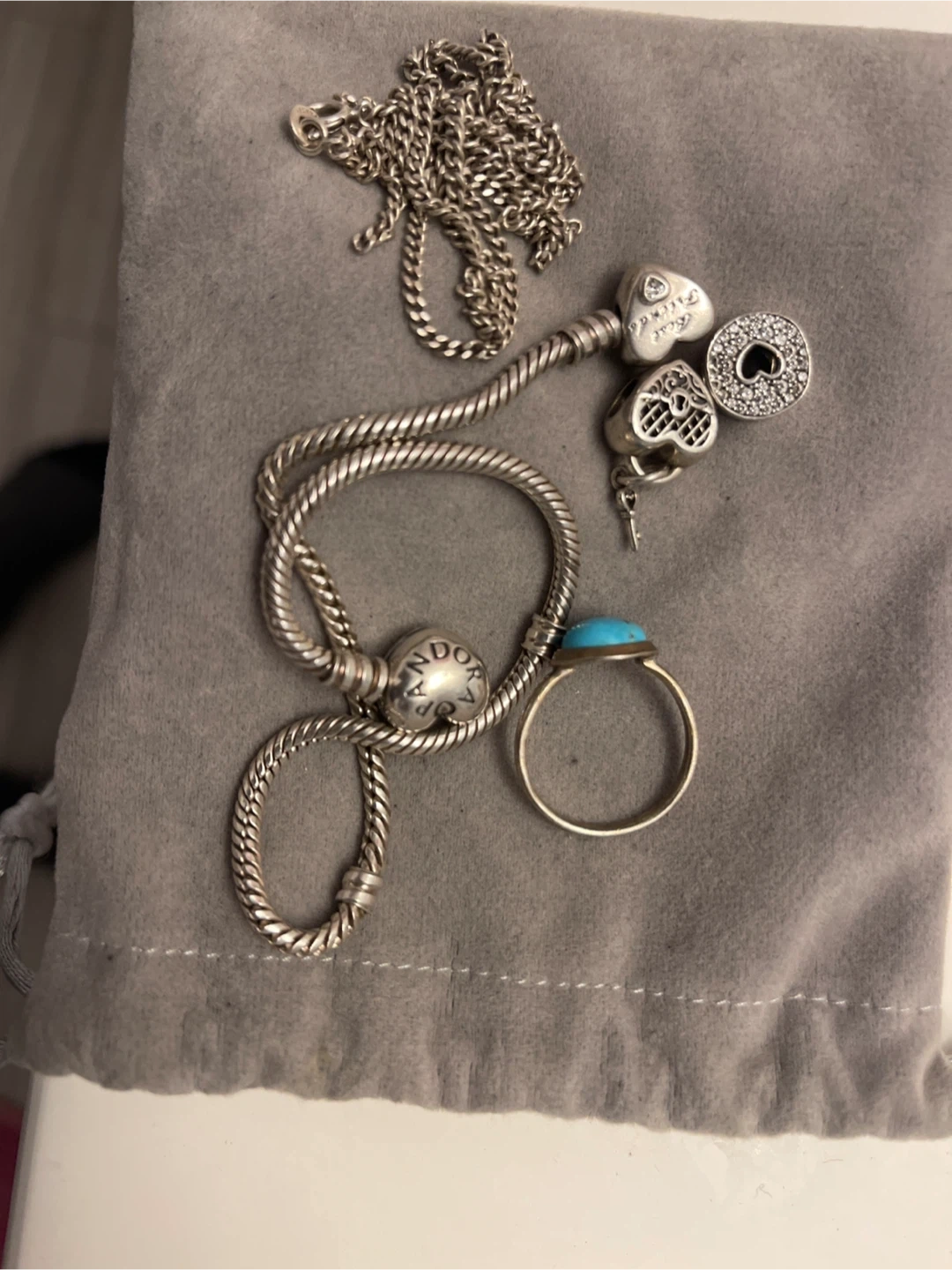 Selling a Pandora bracelet with three charms and a ring. Includes a broken silver necklace . All items are in good used condition! All real silver pandora bracelet is broken
